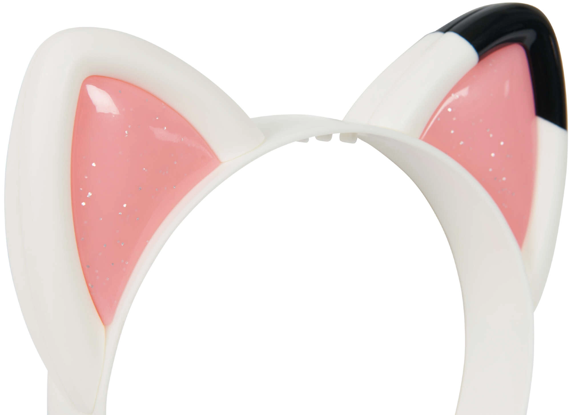 De witte haarband met roze glinsterende binnenkanten en een zwart stipje op één oortje kopieert trouw de look uit de serie.