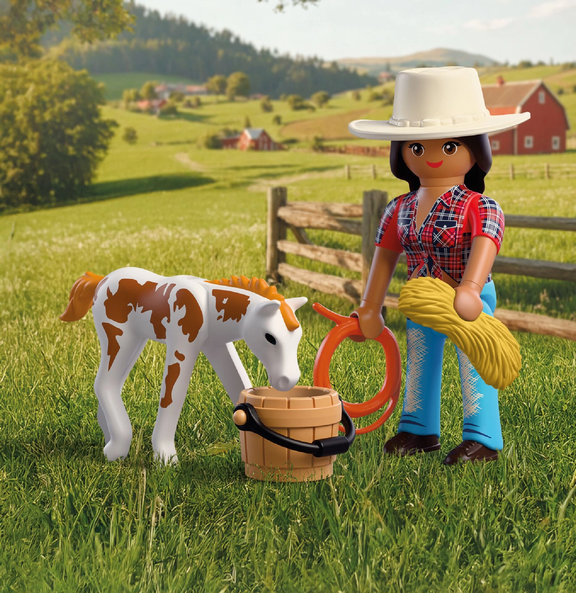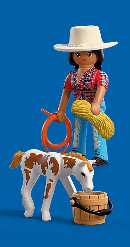 De set bevat een ruiterfiguur (ca. 7,5 cm), een veulen, een lasso, een cowboyhoed, een wateremmer en een baal hooi. De set is te combineren met andere PLAYMOBIL-sets, wat de speelmogelijkheden vergroot en langdurig speelplezier ondersteunt.
