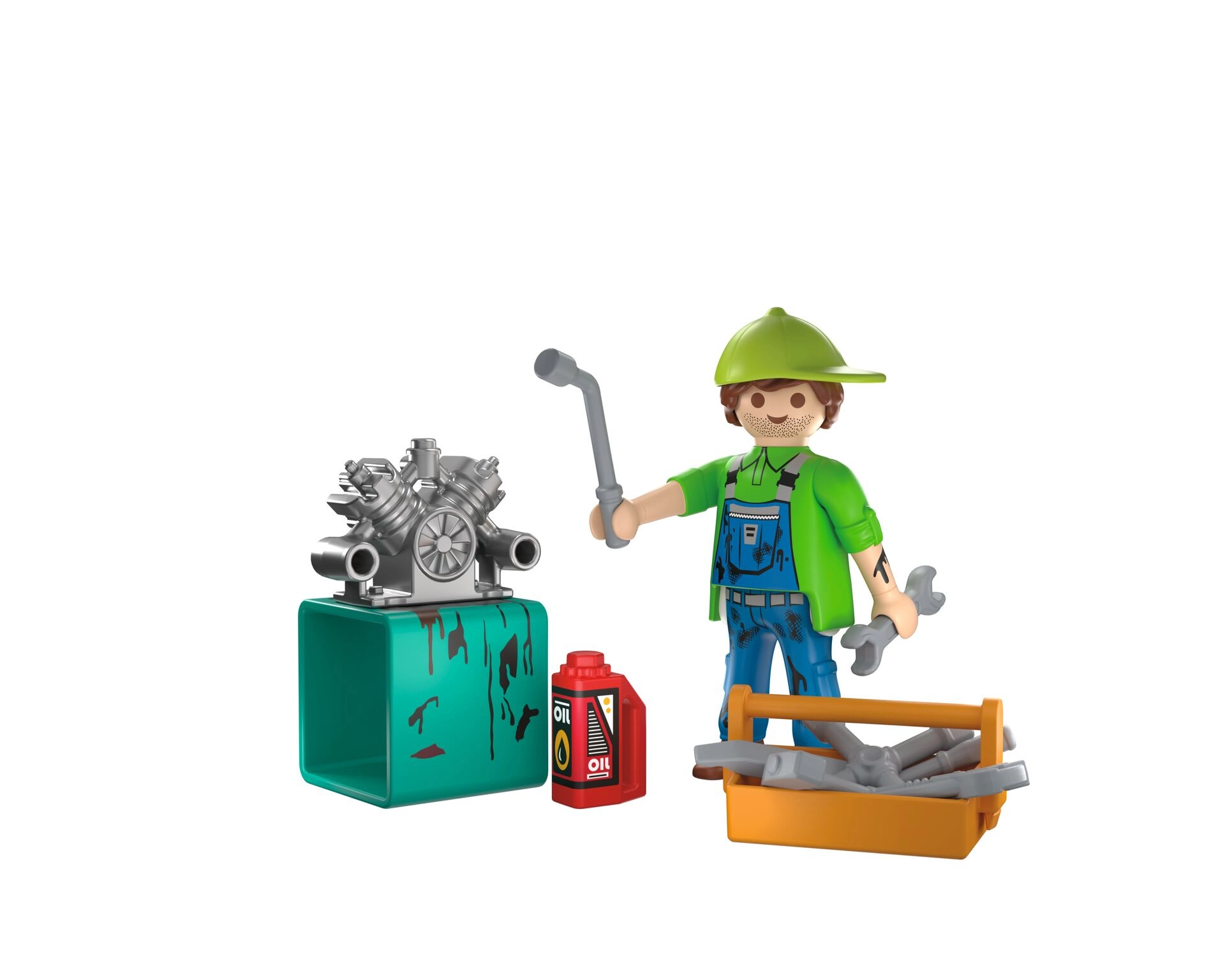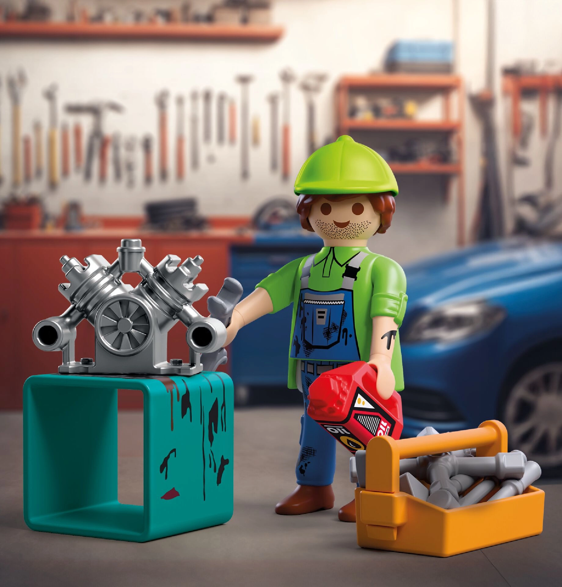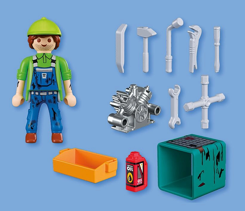 Inbegrepen zijn een monteursfiguur (ca. 7,5 cm), een motorblok op een turquoise standaard, een oliespuit, een oranje onderdelenkist en een gereedschapsset voor realistische reparaties in rollenspel. De set is eenvoudig te combineren met andere PLAYMOBIL-bouwsets, zodat je je eigen werkplaats of servicepunt kunt creëren.