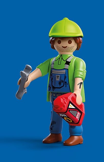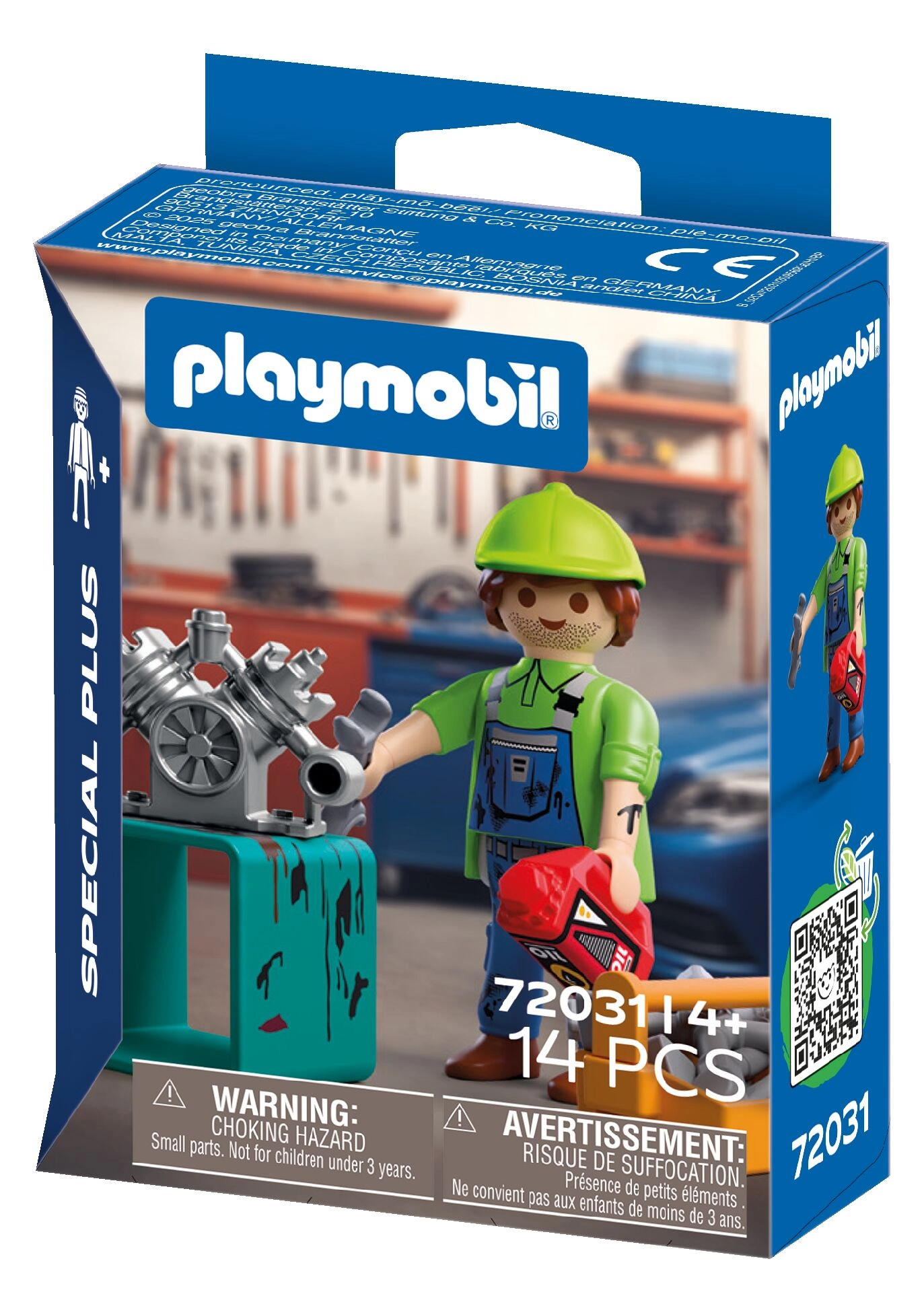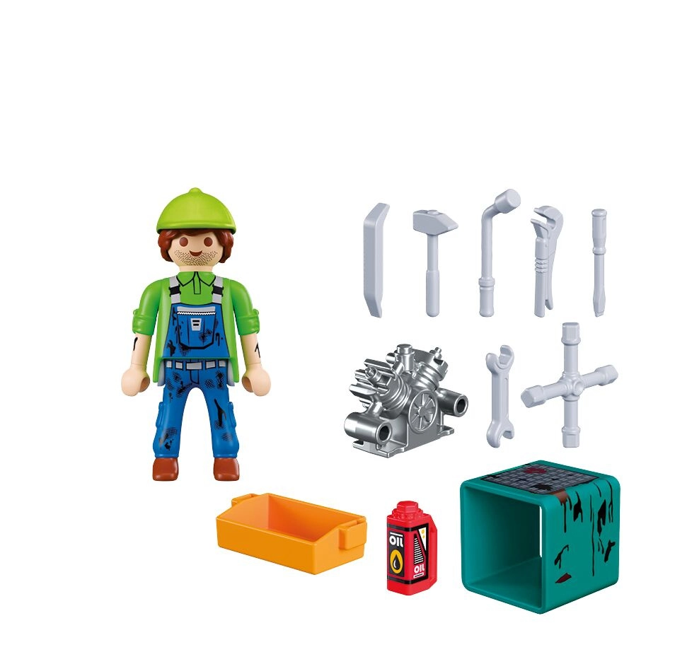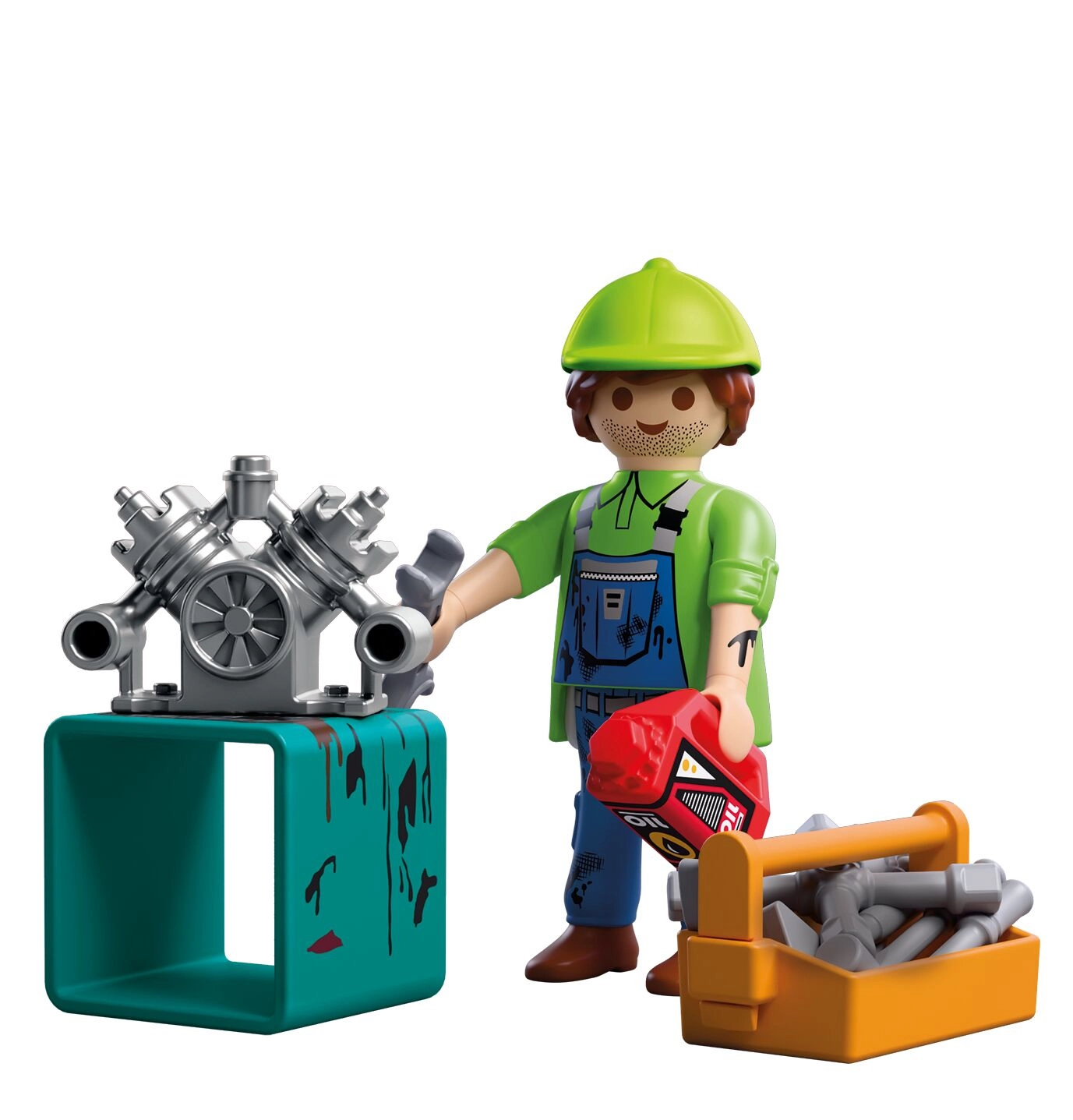Inbegrepen zijn een monteursfiguur (ca. 7,5 cm), een motorblok op een turquoise standaard, een oliespuit, een oranje onderdelenkist en een gereedschapsset voor realistische reparaties in rollenspel. De set is eenvoudig te combineren met andere PLAYMOBIL-bouwsets, zodat je je eigen werkplaats of servicepunt kunt creëren.