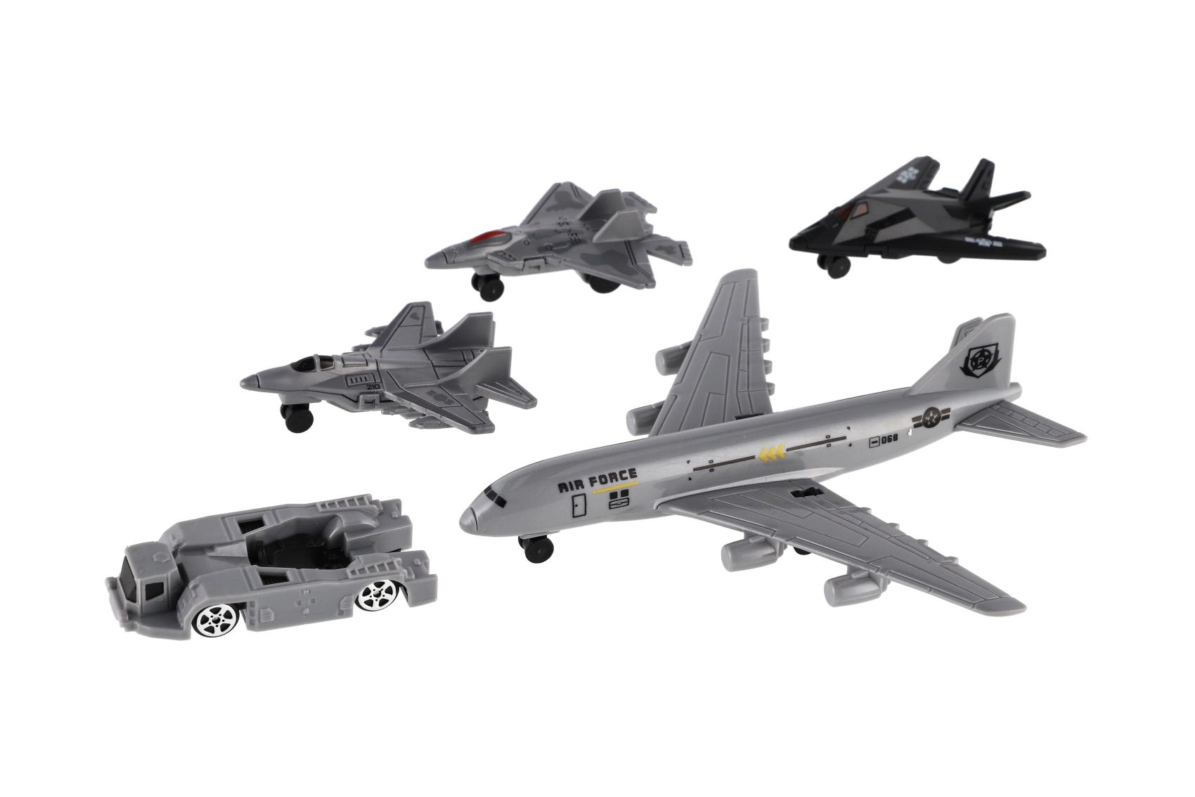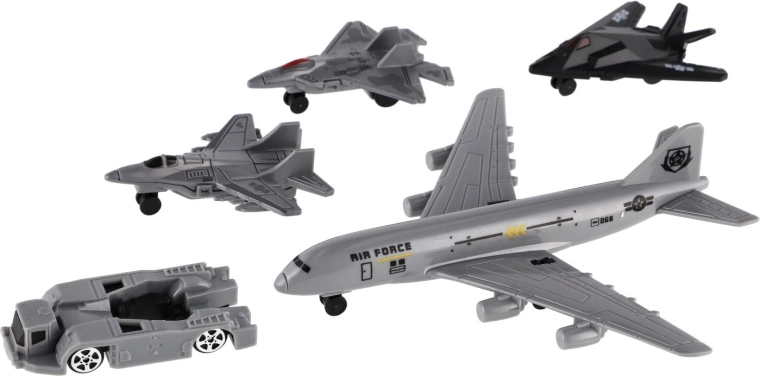 - Complete set 5 stuks: groot vliegtuig, 3 straaljagers, grondvoertuig