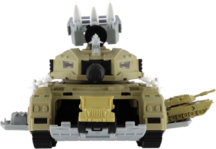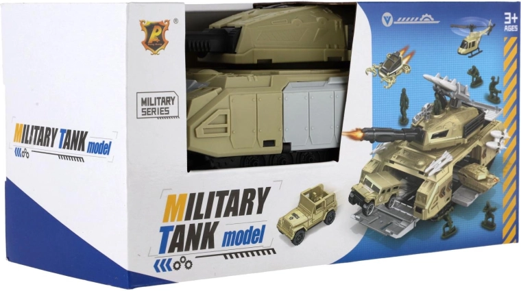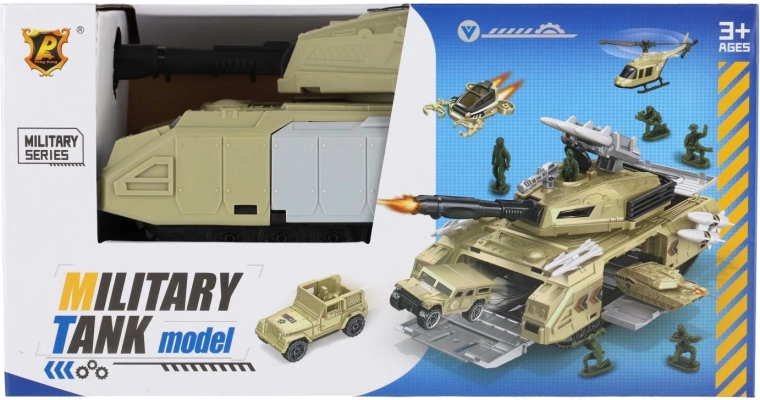 De tank wordt aangevuld met soldatenfiguren, begeleidende voertuigen en een helikopter. Kinderen kunnen uitgewerkte scènes creëren en hun verbeelding en samenwerking ontwikkelen.
