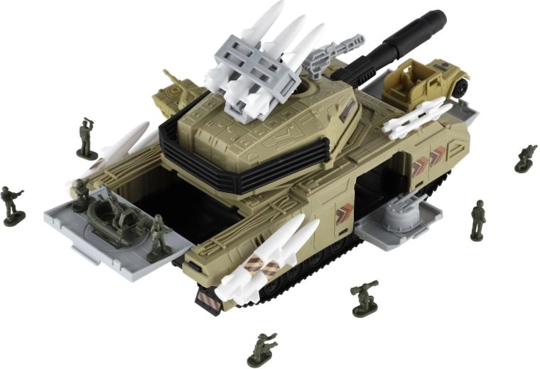 Actiespeelgoed voor kleine legerfans: kunststof tank met gedetailleerde afwerking, vrijloop en rijke accessoires. Openende delen en meegeleverde voertuigen, helikopter en soldatenfiguren ondersteunen creatief en thematisch spel vol missies en avonturen.