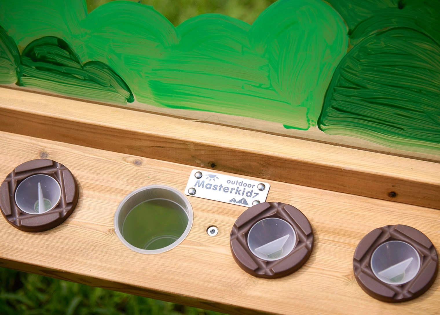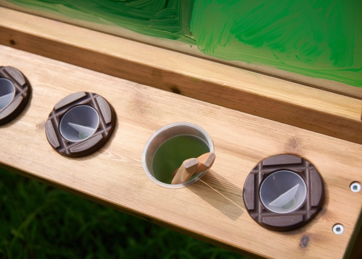 De stabiele, weer- en UV-bestendige constructie is ideaal voor buitengebruik. Geïntegreerde houders voor bekers, water en kwasten houden alles overzichtelijk bij de hand, terwijl de onderste plank extra opbergruimte biedt. De schilderhoogte is afgestemd op oudere kinderen, maar is ook inspirerend voor jongere makers onder toezicht van een volwassene.