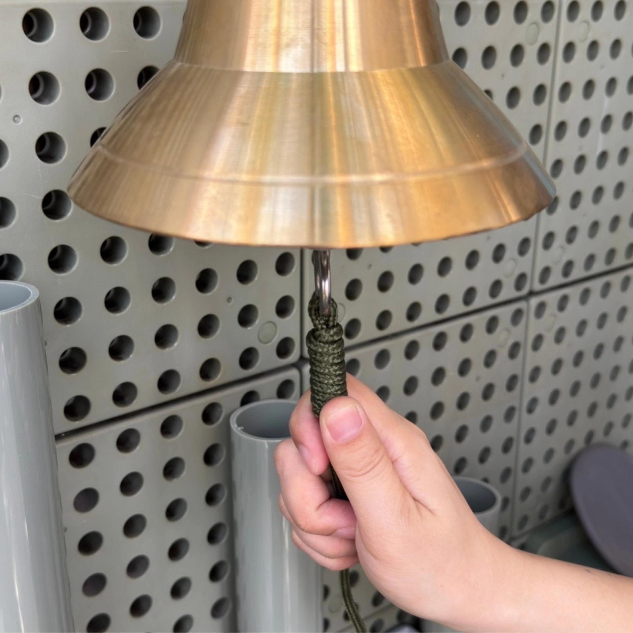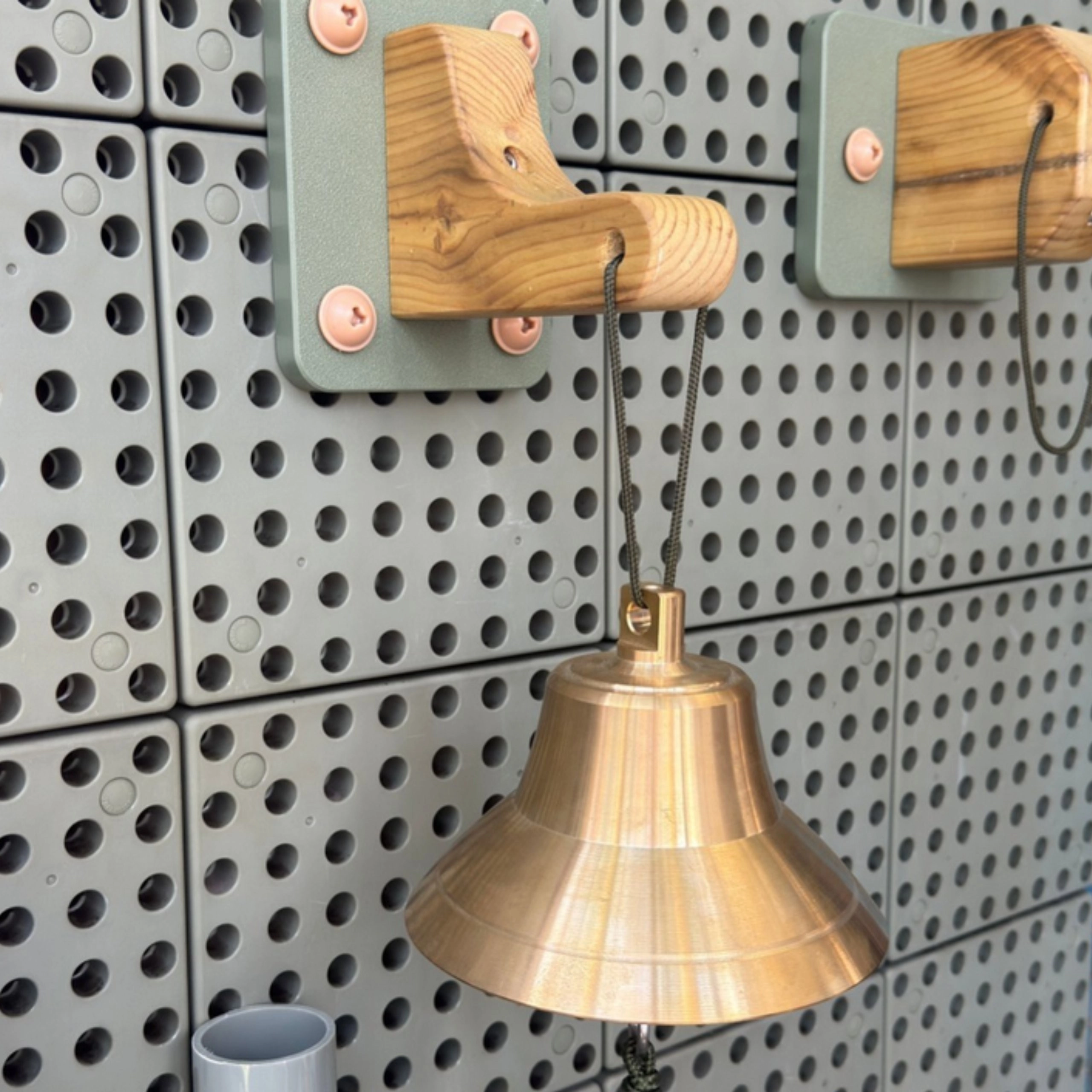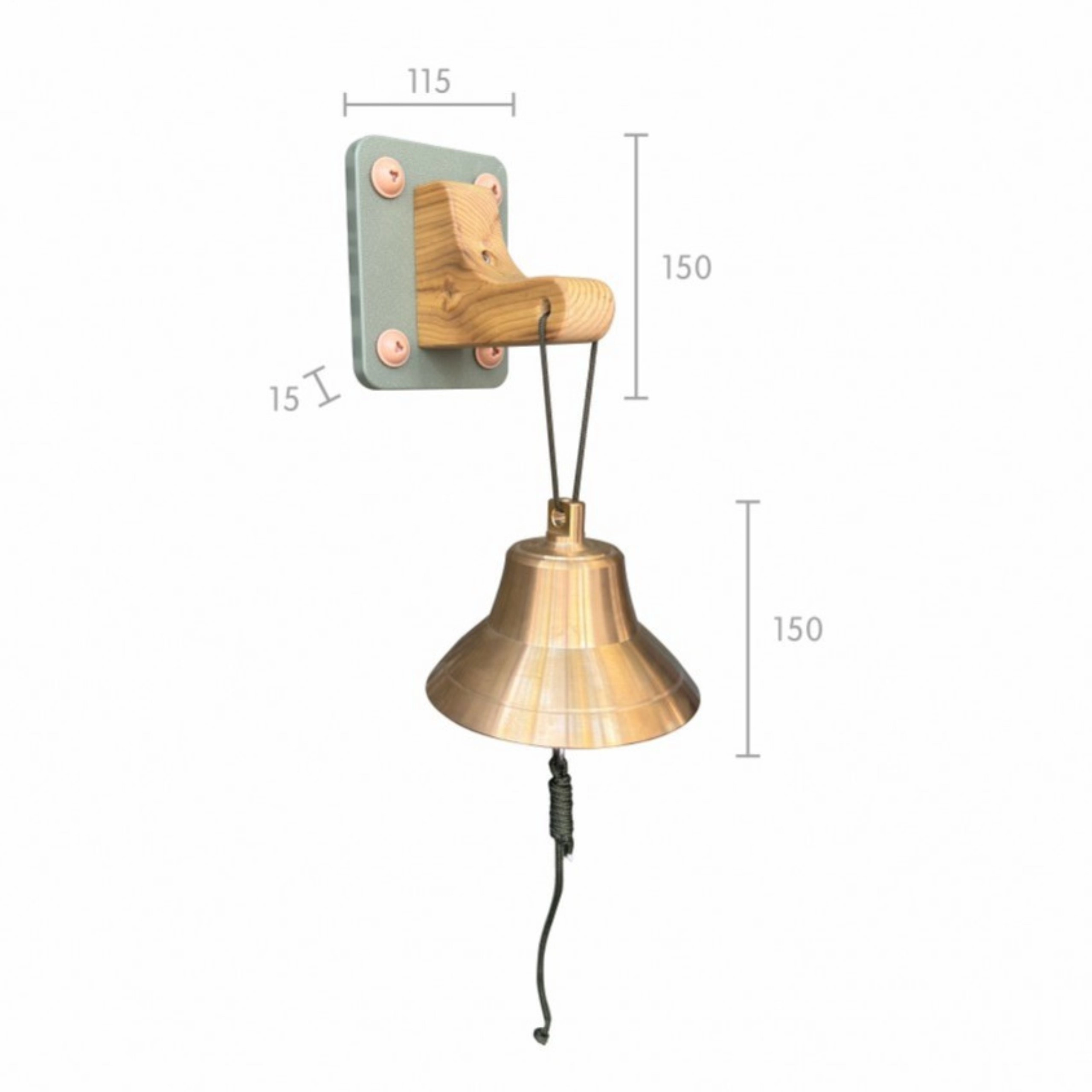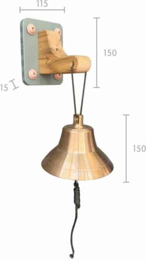 - Bronzen bel (15 cm), houten wandhouder, stevig koord
