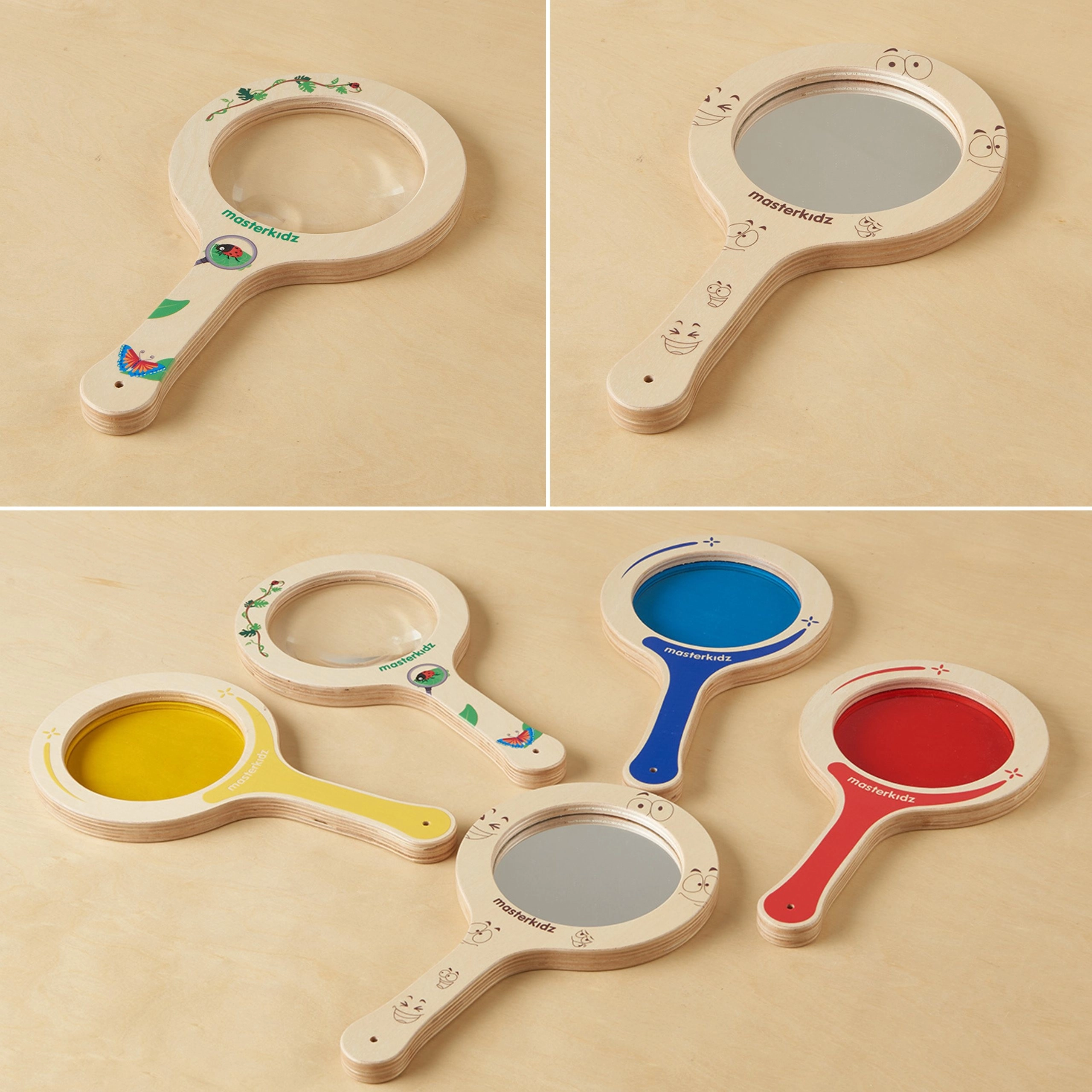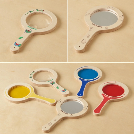 Met deze creatieve set kinder-peddels zien kinderen de wereld in rode, blauwe en gele tinten, leren ze de basis van lichtfysica en trainen ze hun visuele waarneming. De klassieke loep ondersteunt nieuwsgierige natuurobservaties, terwijl het veilige spiegeltje de ontwikkeling van emotionele intelligentie via mimiekspel stimuleert.