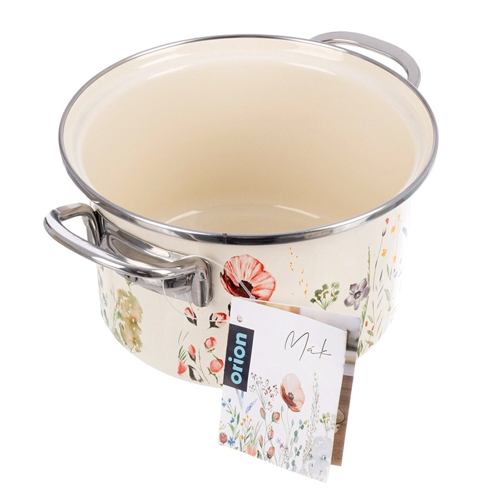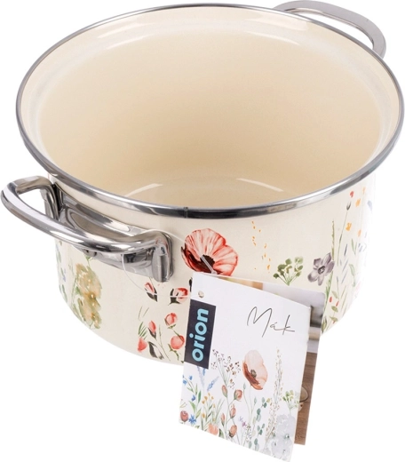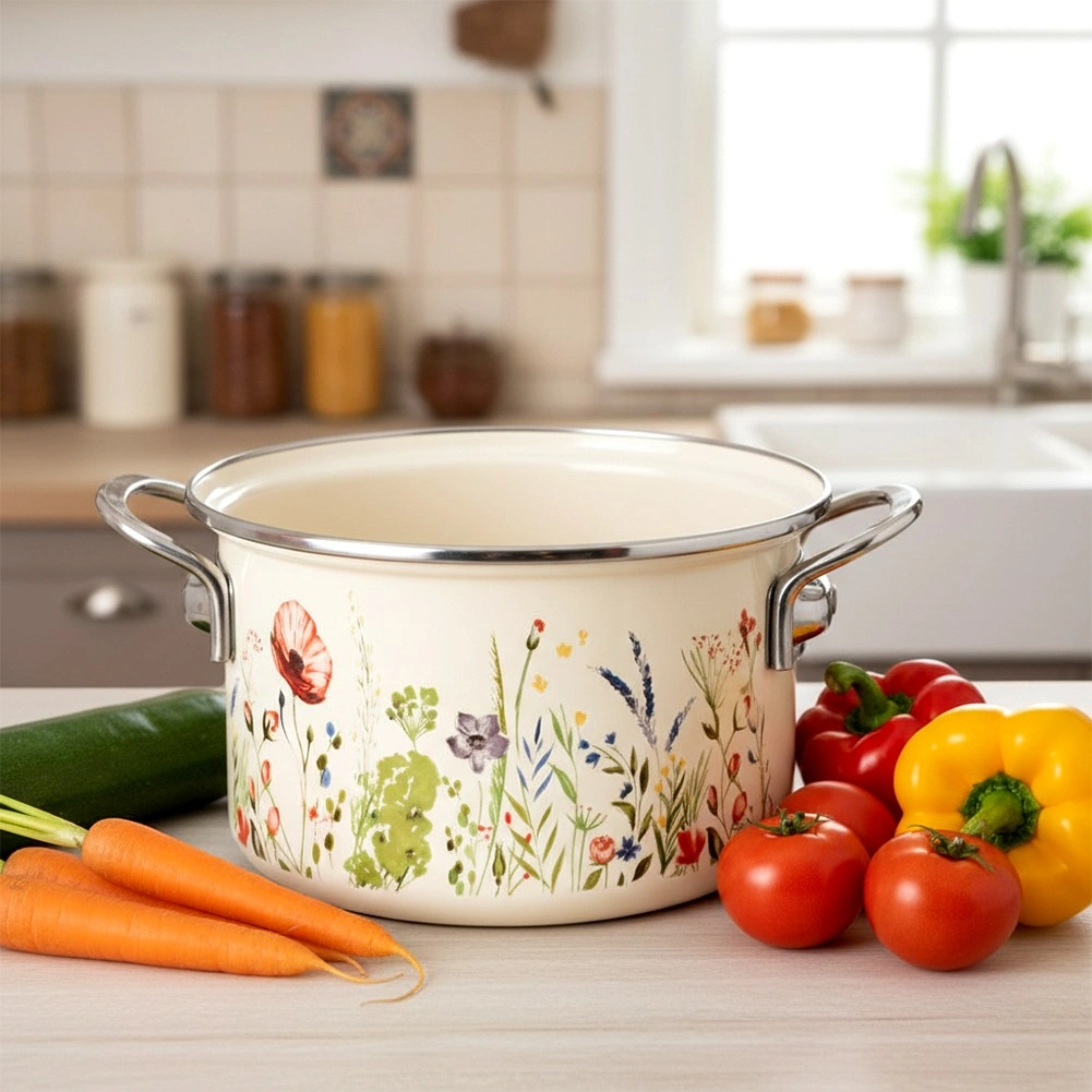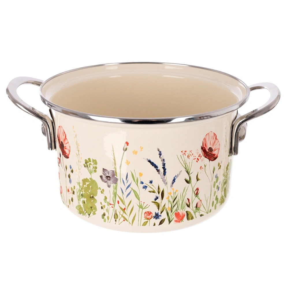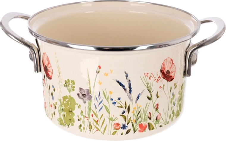 Ontdek de tijdloze charme van retrodesign en functionaliteit in één. De crèmekleurige geëmailleerde pan met veldbloemmotief wordt de blikvanger van elke keuken. Dankzij hoogwaardig geëmailleerd staal geleidt hij warmte uitstekend, is hij duurzaam en eenvoudig te reinigen. De roestvrijstalen rand en stevige zijhandgrepen zorgen voor veilige hantering.