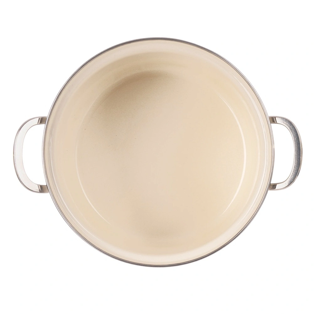 Het duurzame geëmailleerde oppervlak is voedselvriendelijk en veilig, ook voor allergiepatiënten. De roestvrijstalen rand en grepen verhogen de duurzaamheid en vergemakkelijken de hantering.