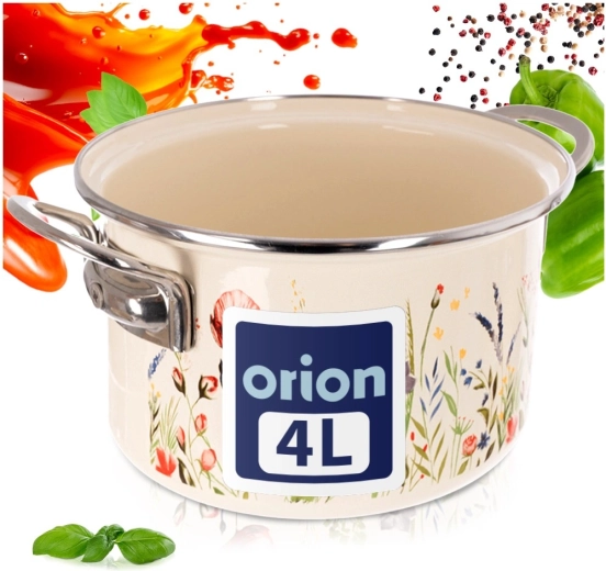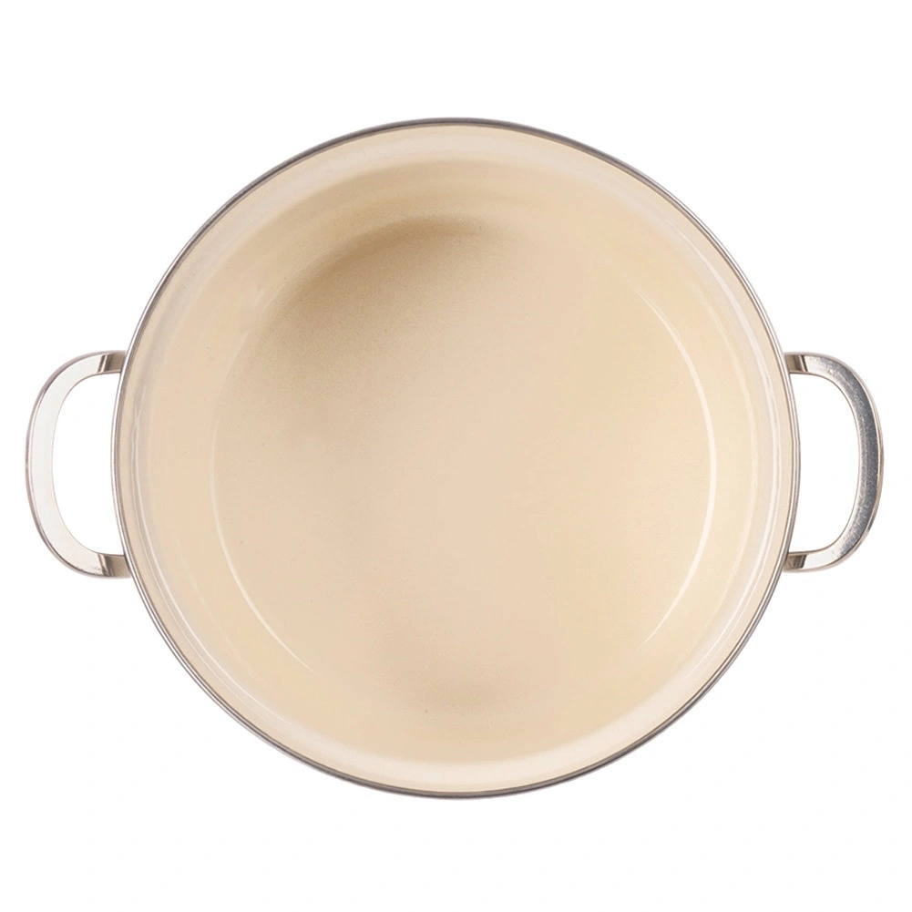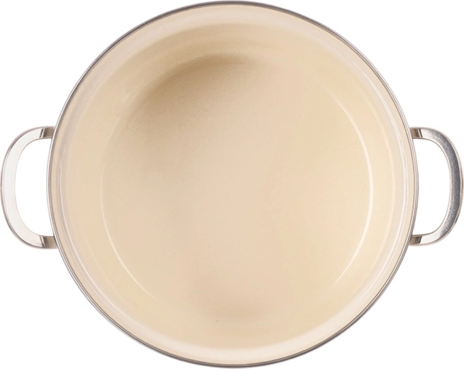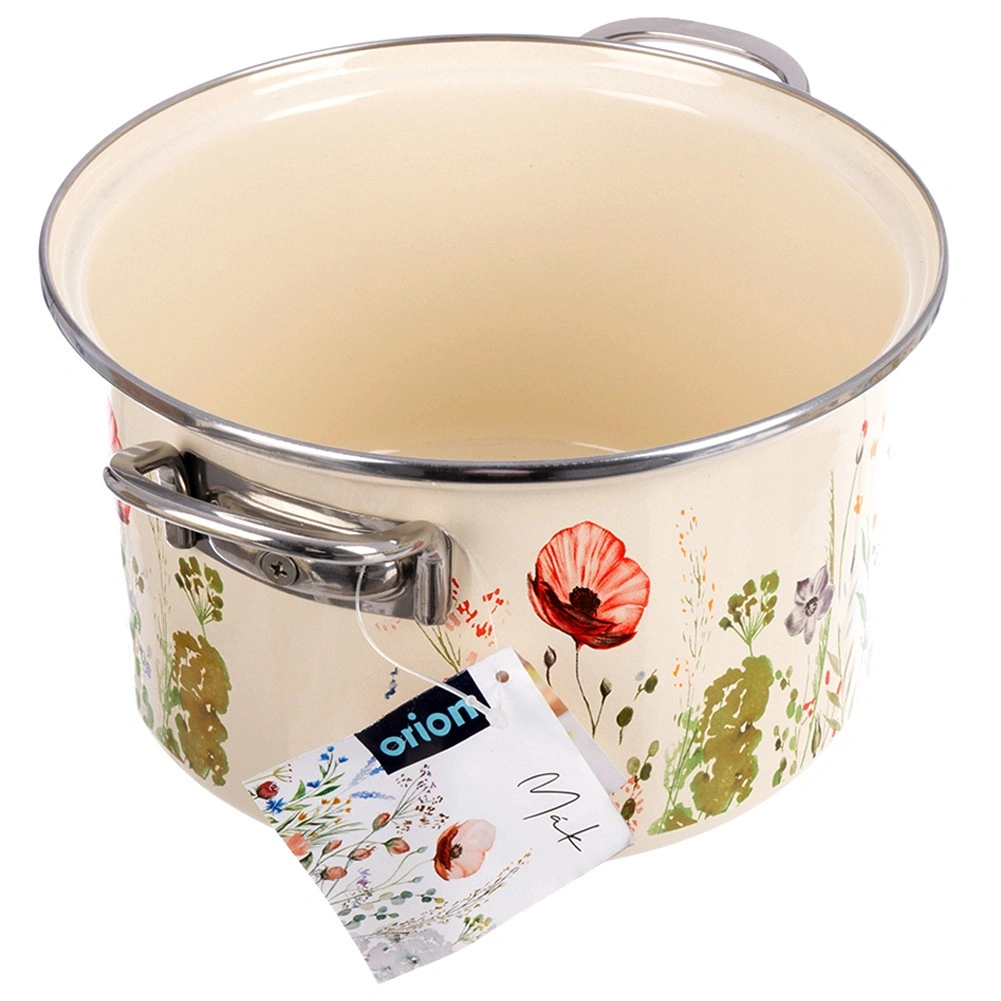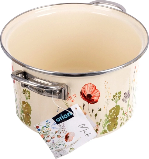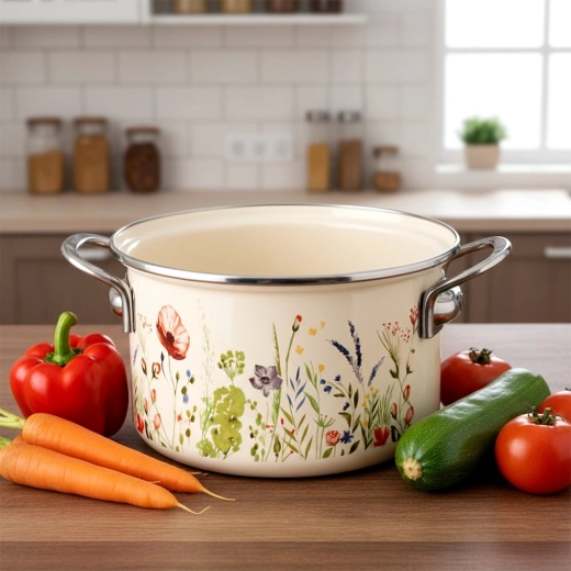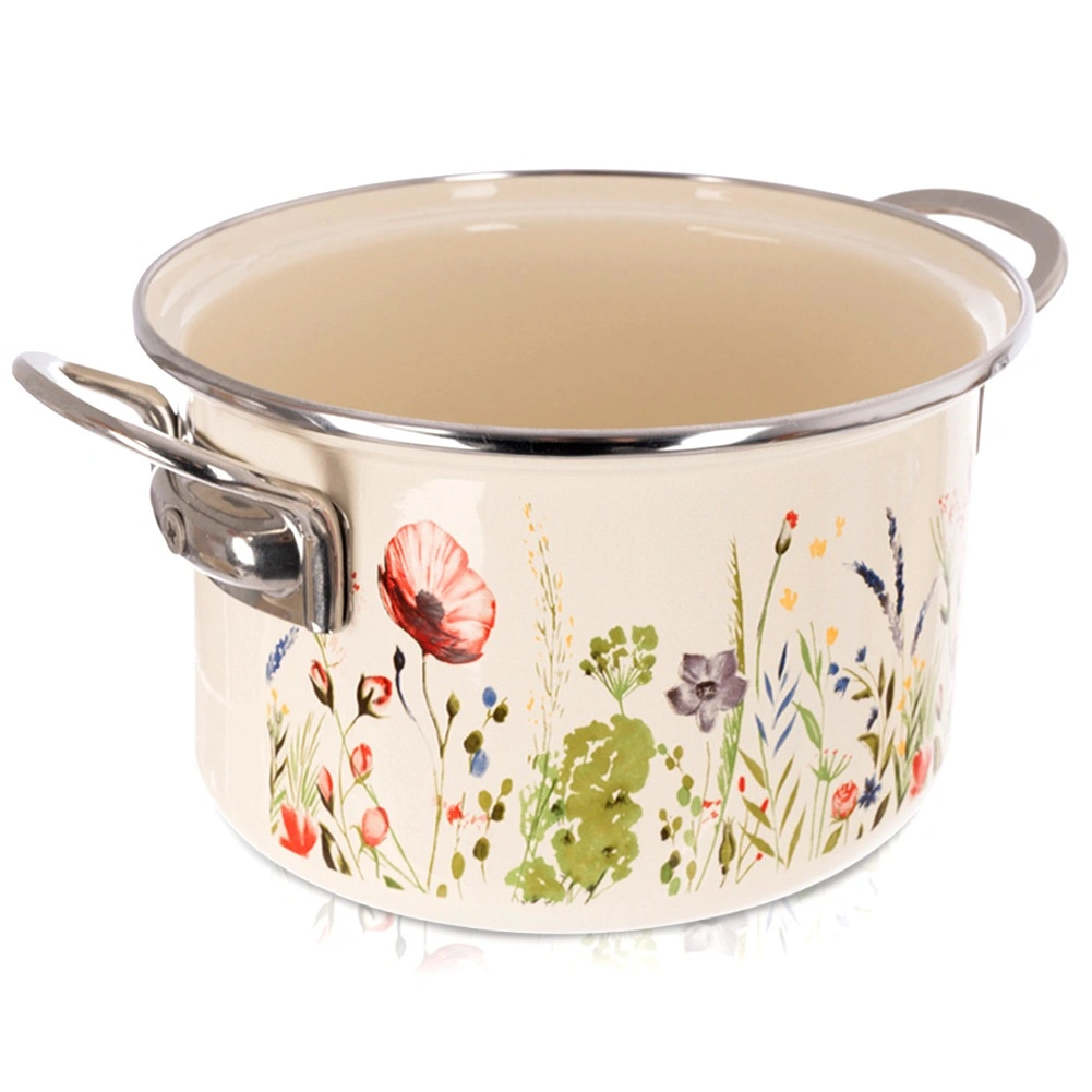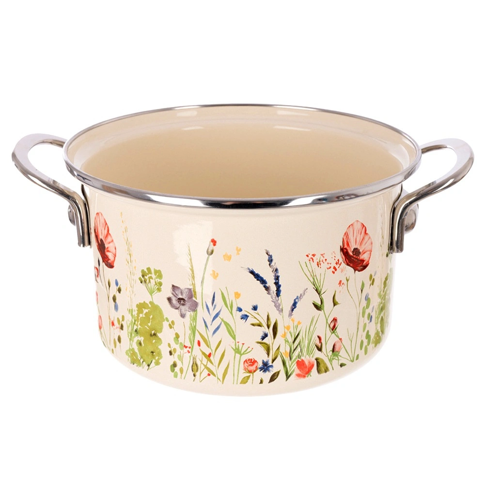 Body van geëmailleerd staal in crèmekleur met bloemendecor, roestvrijstalen rand en handgrepen voor een langere levensduur en eenvoudig reinigen.