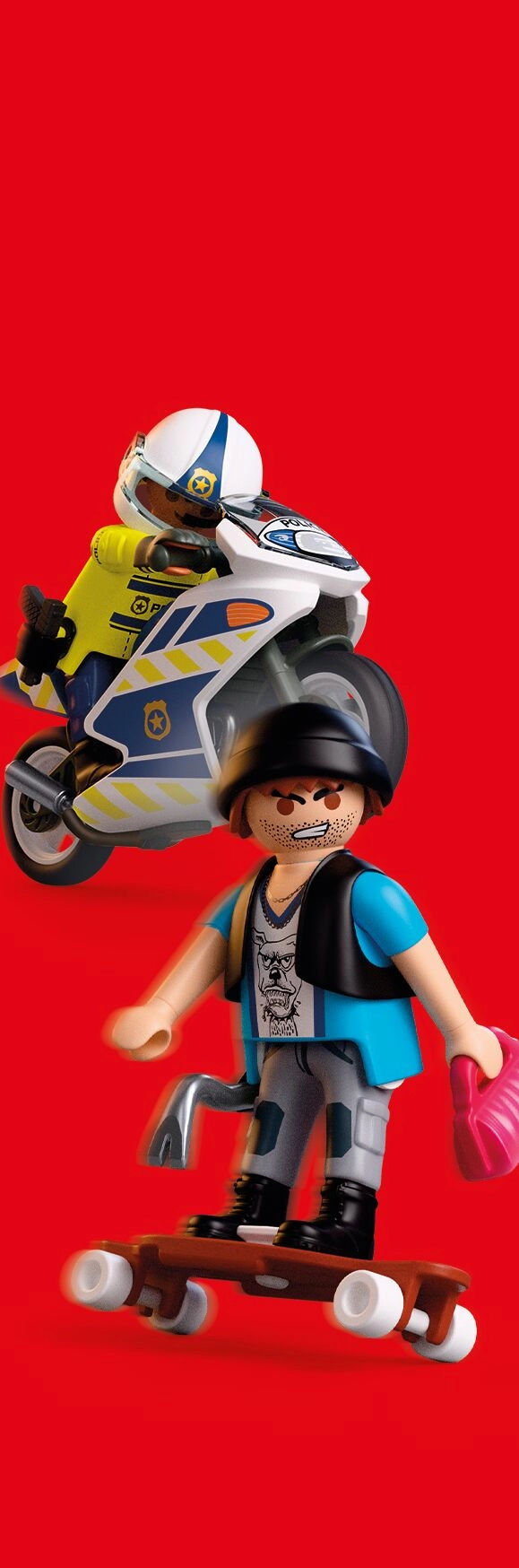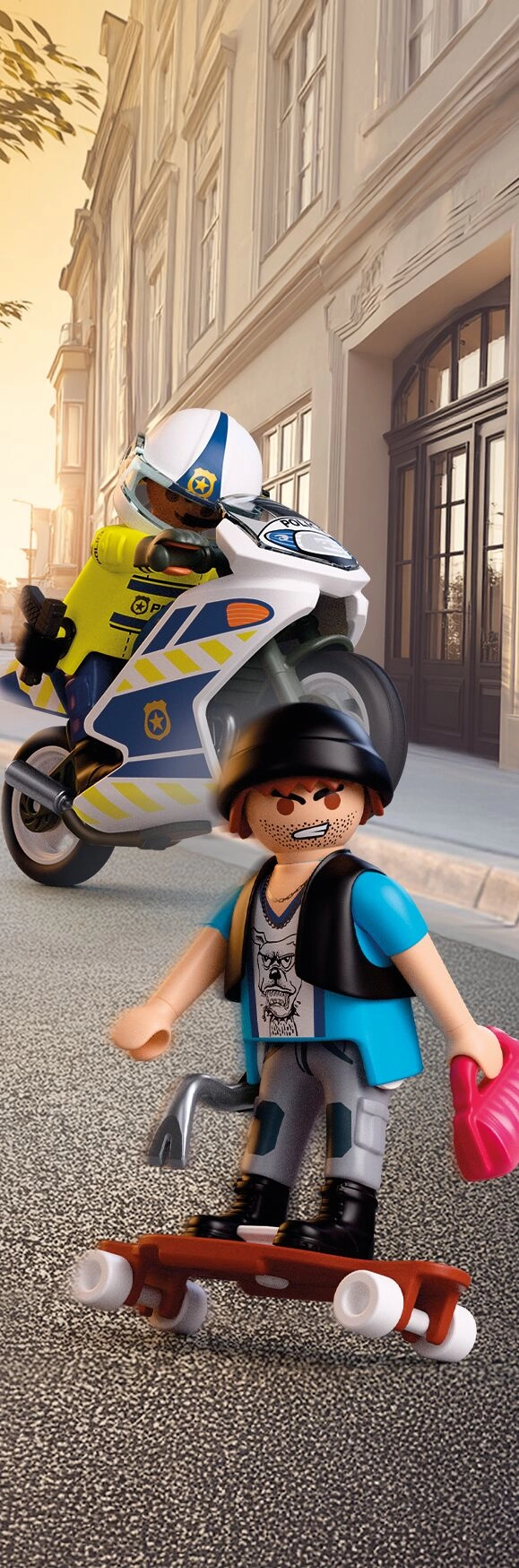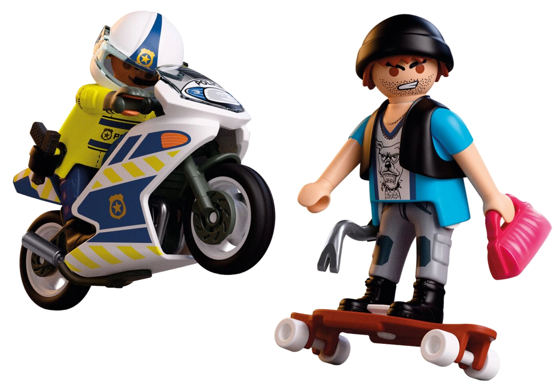 - Inhoud van de set: 2 figuren (agent en dief, ca. 7,5 cm), politiemotor, skateboard/longboard, helm, handschoenen, holster, pistool, pet, handtas, houder en koevoet.