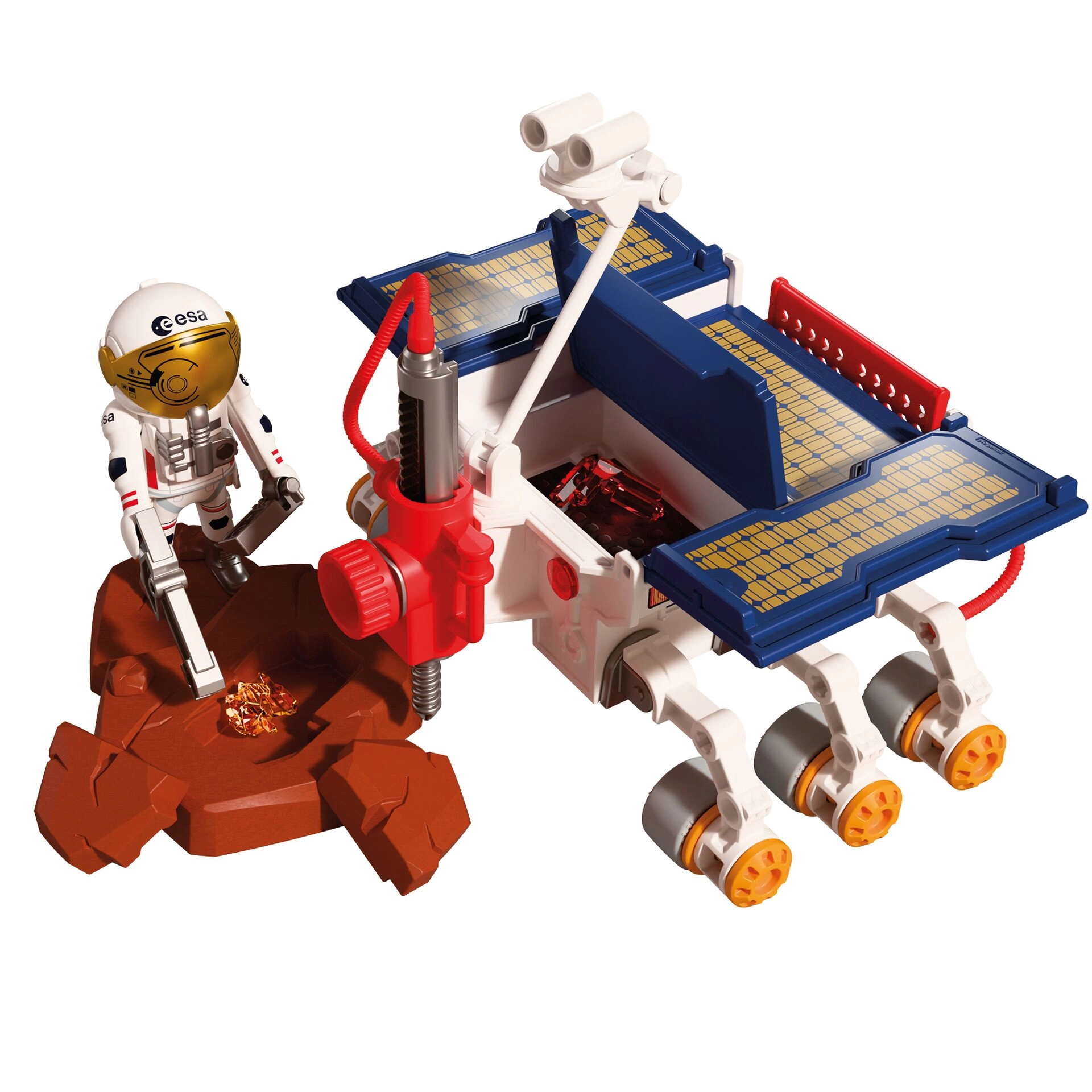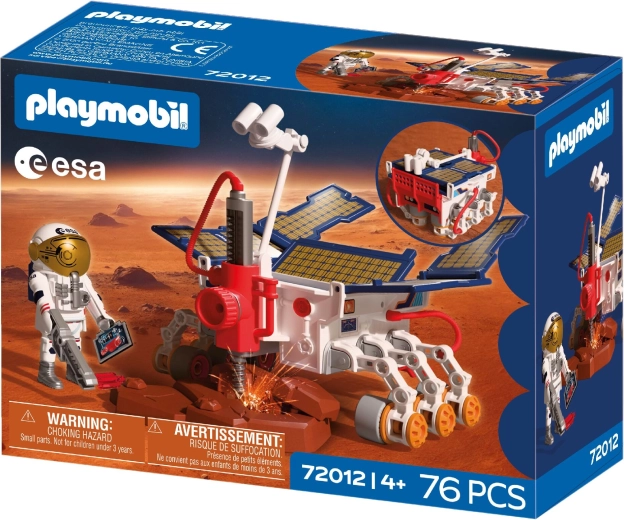 Ontdek de rode planeet met een realistische PLAYMOBIL-set ontwikkeld in samenwerking met de Europese Ruimtevaartorganisatie (ESA). De robuuste Marsrover met boormodule, camera’s, sensoren en uitklapbare zonnepanelen laat kinderen het terrein verkennen, monsters verzamelen en een authentieke wetenschappelijke expeditie beleven. Beweegbare onderdelen en functionele accessoires stimuleren creatief rollenspel en de ontwikkeling van de verbeelding.