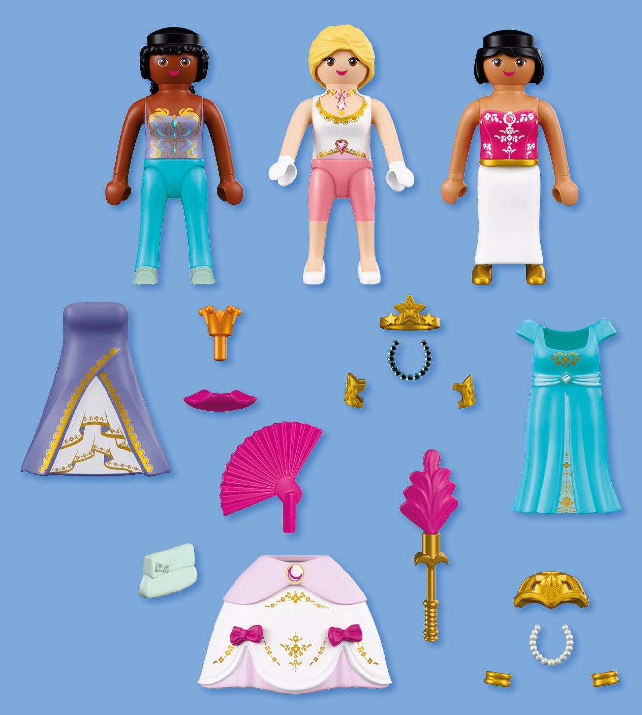 - Inhoud van de set: 3 prinsessenfiguren (ca. 7,5 cm), 2 jurken, rok, kroon, kroon met ster, haarnetje, waaier, kraag, 2 kettingen, scepter met veer, 2 armbanden, 2 manchetten