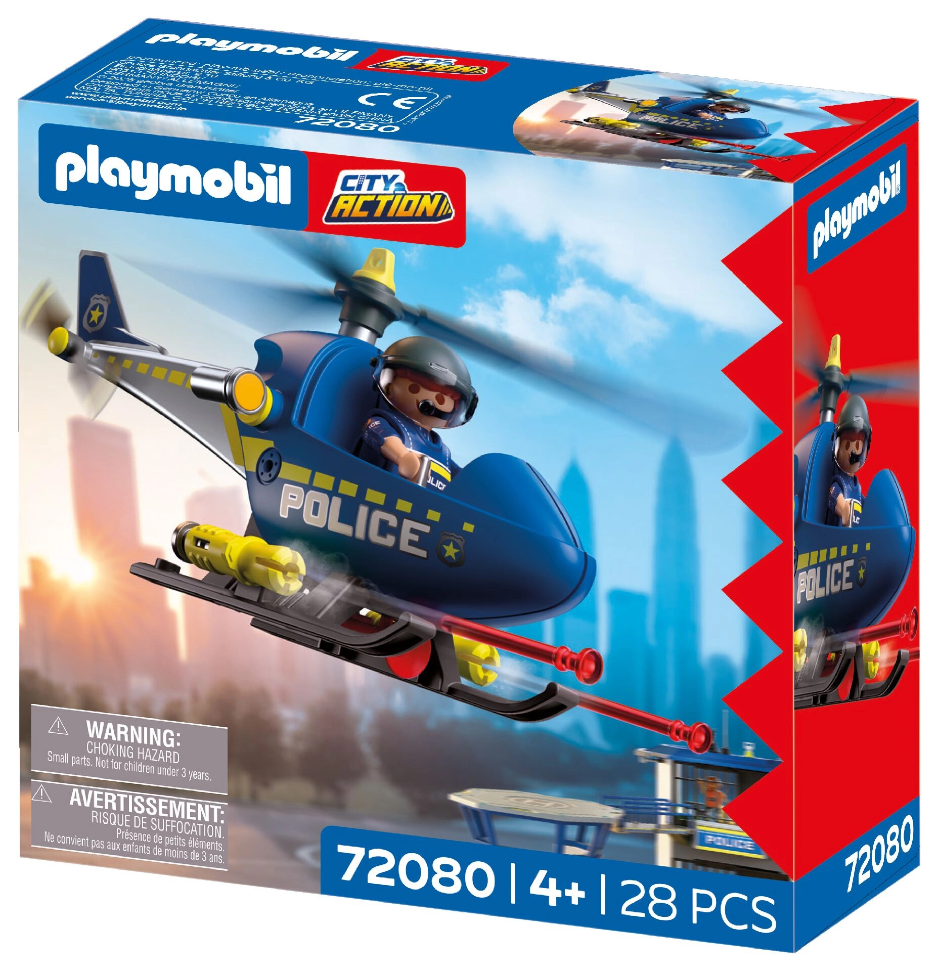 De PLAYMOBIL City Action-set brengt dynamische actie naar de kinderkamer. De helikopter met roterende rotors maakt soepele manoeuvres mogelijk, terwijl de politieagent het gebied controleert, via de megafoon omroept en veilige waarschuwingsschoten uitvoert. Kinderen bedenken moeiteloos hun eigen verhalen vol spanning en avontuur.