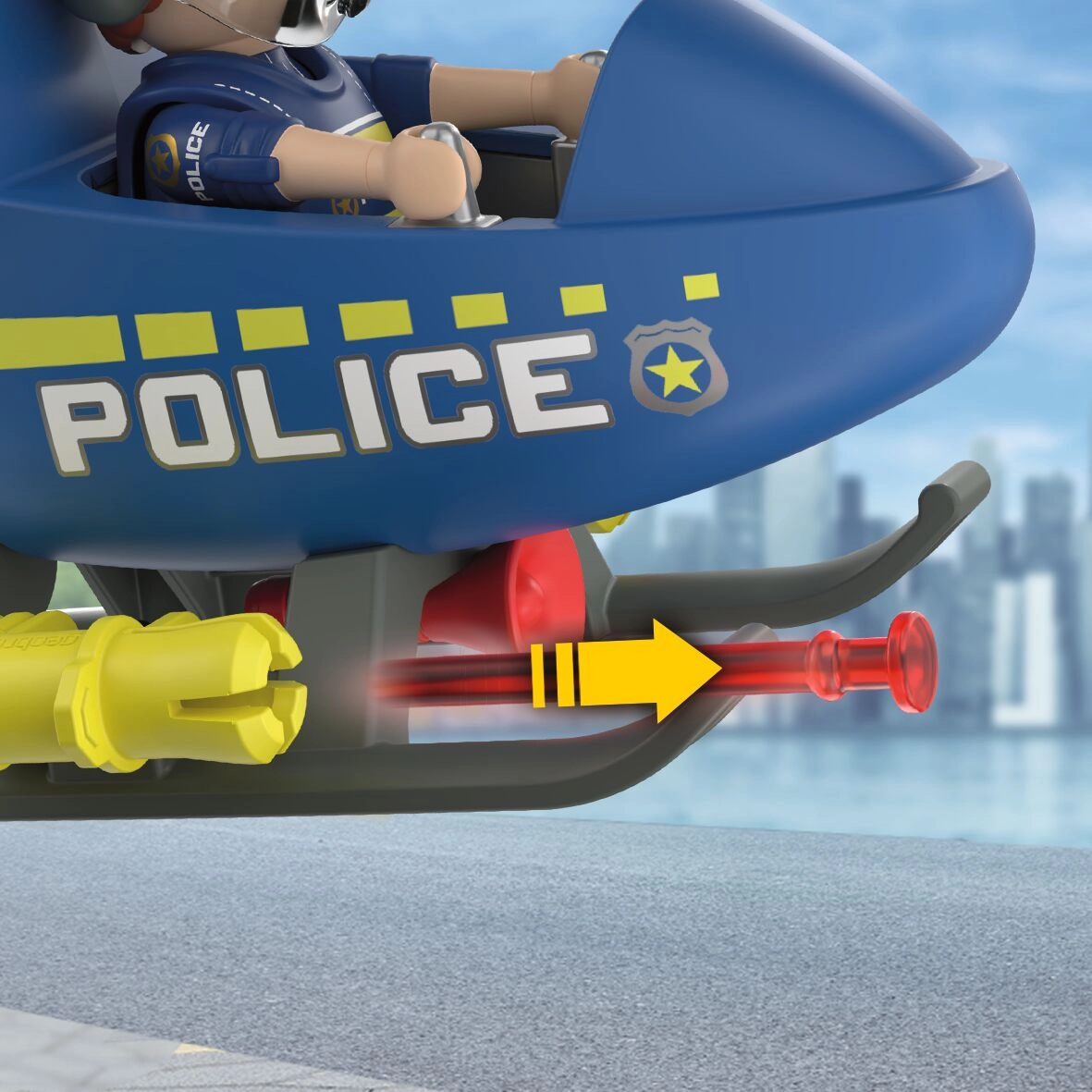 - Politiefiguur (ca. 7,5 cm), helikopter, helm, 2 wapens, 3 projectielen, megafoon