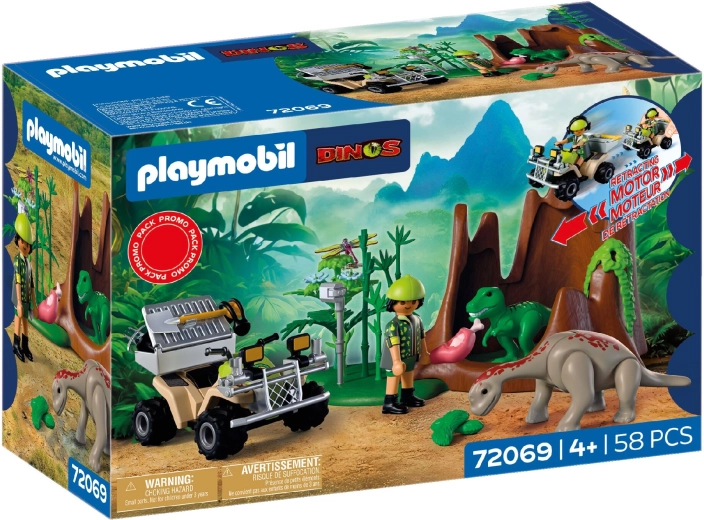Ontdek de wereld van de prehistorie met de PLAYMOBIL Dinos speelfset, waarin een dappere onderzoeker door de wildernis rijdt op een quad met pull-back aandrijving, een T‑Rex-jong en een Brachiosaurus-jong vindt en monsters verzamelt. Inclusief een afneembare transportkist en een uitgebreide set accessoires voor realistische expedities en het stimuleren van de fantasie van kinderen.