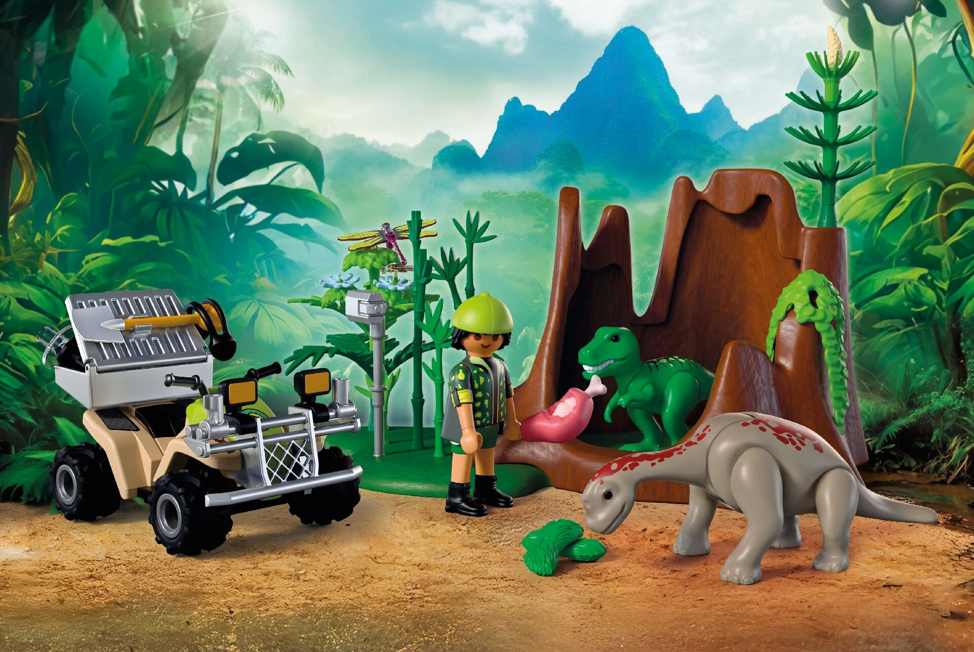 - Figur van onderzoeker (~7,5 cm), quad met pull-back aandrijving, afneembare transportkist, helm met koptelefoon, schepje, richtmicrofoon, camera, boomstronk, basis, 8 kransen van takken, 5 bamboeplanten, 3 bloemen, hangende begroeiing, bot met vlees, bot, 2 graspollen, T‑Rex-jong, Brachiosaurus-jong, 2 libellen