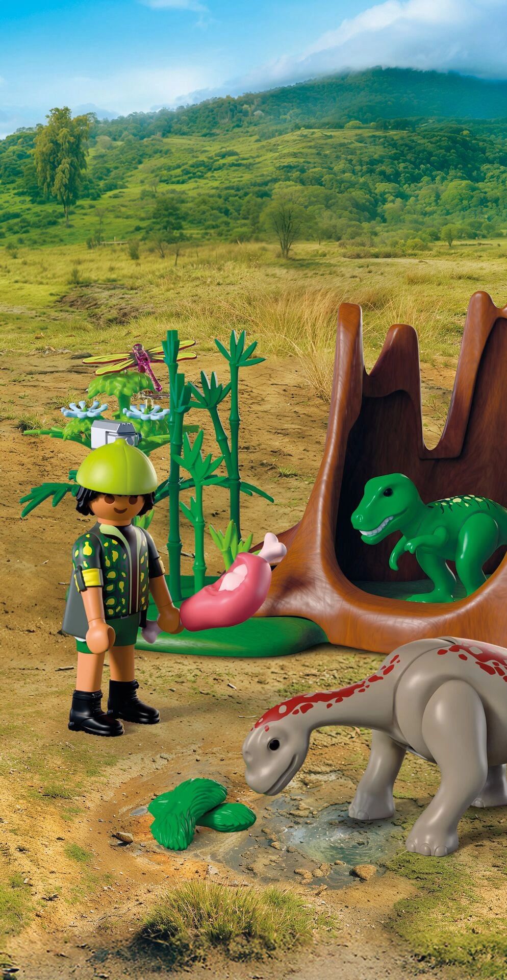 Realistische omgevingsdetails – boomstronk, bamboe, bloemen en begroeiing – samen met de dinosaurusfiguren trekken kinderen het verhaal vol spanning in. De set is perfect voor rollenspel en kan gecombineerd worden met andere PLAYMOBIL-sets voor een nog grotere wereld van prehistorische avonturen.