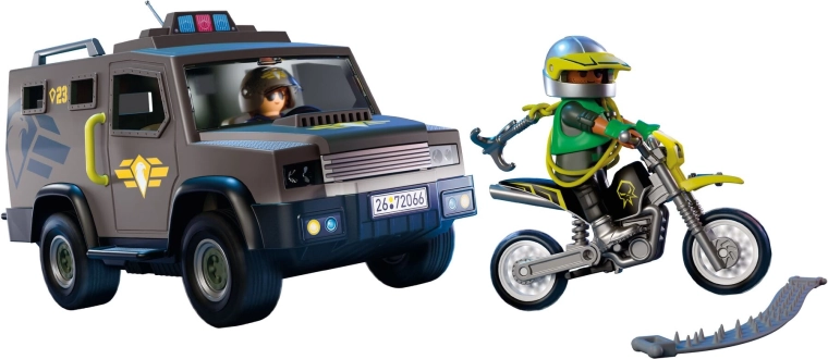 De actieset Playmobil SWAT tactische wagen biedt alles wat je nodig hebt voor een geslaagde interventiemissie. De gepantserde wagen met een afneembaar dak en openende achterdeuren biedt eenvoudig plaats aan de uitrusting van de eenheid en de spijkermat om een vluchtende dader op een motorfiets te stoppen. De functionele lichtbalk zorgt voor extra authenticiteit en verhoogt de beleving bij elke achtervolging.
