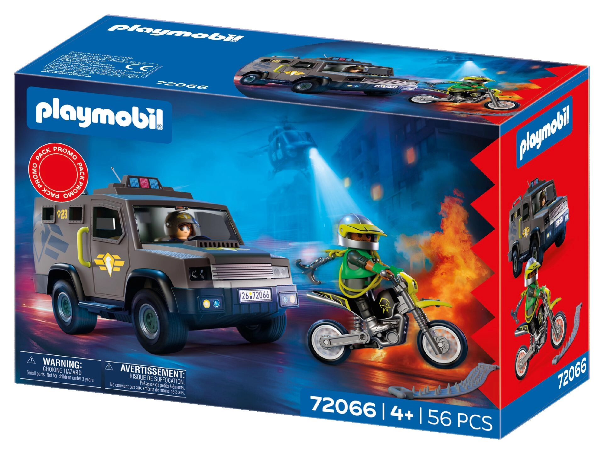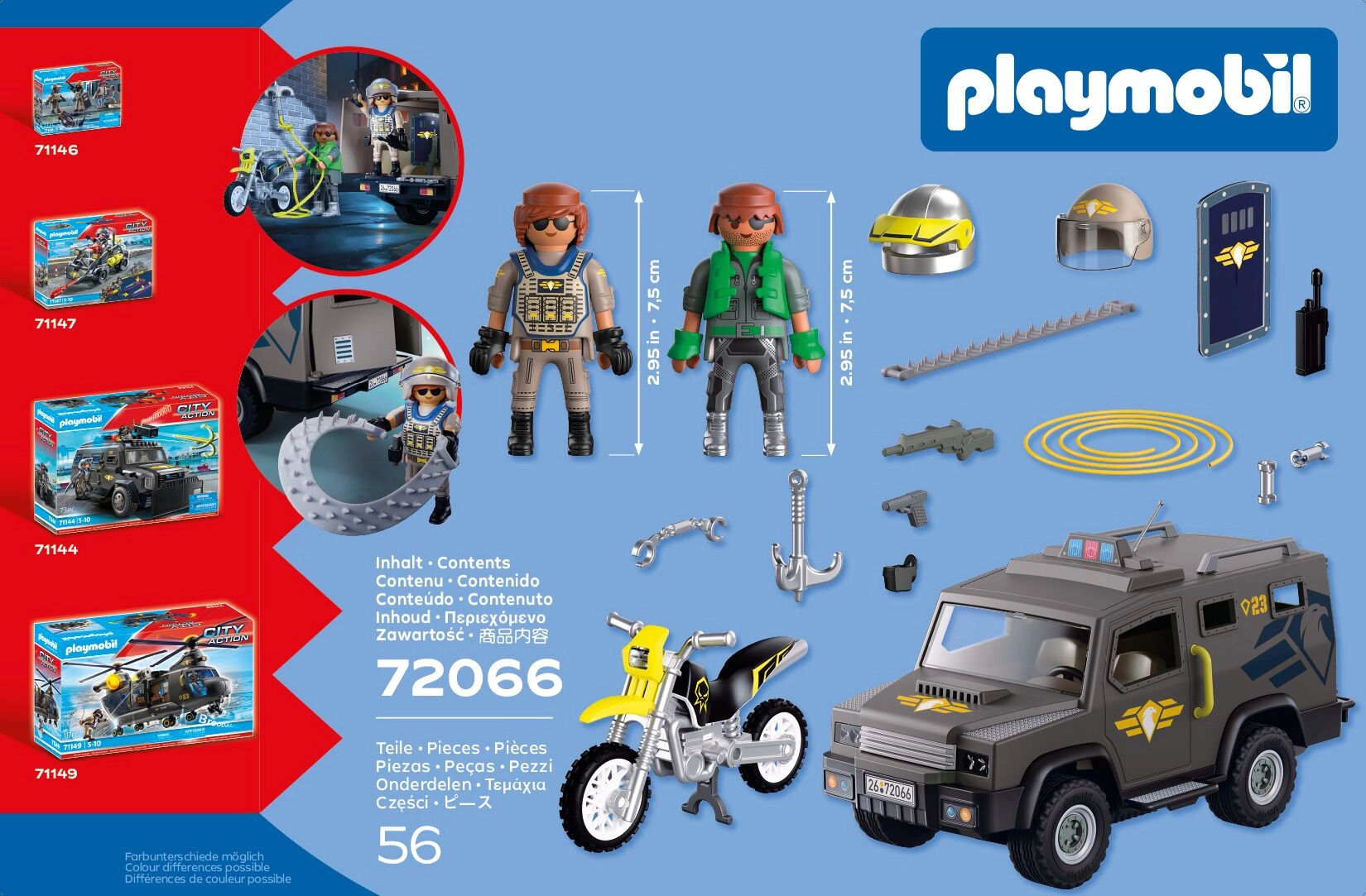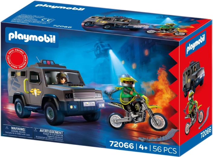 Inbegrepen zijn 2 figuren – een SWAT-agent en een crimineel – en tal van accessoires, zoals handboeien, schild, walkietalkie en wapens, waarmee kinderen tactiek kunnen trainen en hun verbeelding kunnen ontwikkelen bij het rollenspel. De set is compatibel met andere Playmobil-bouwsets en vergroot zo de speelmogelijkheden.