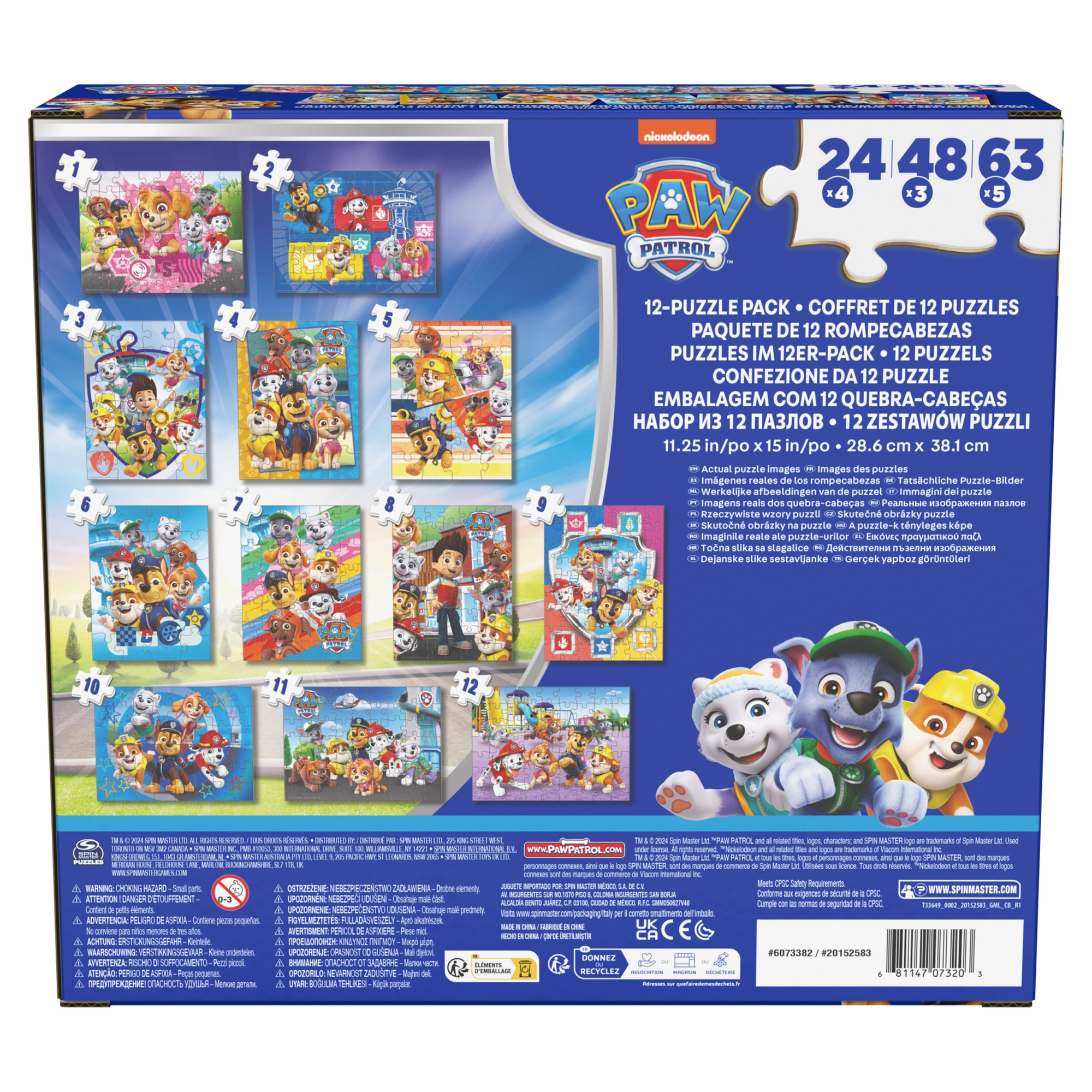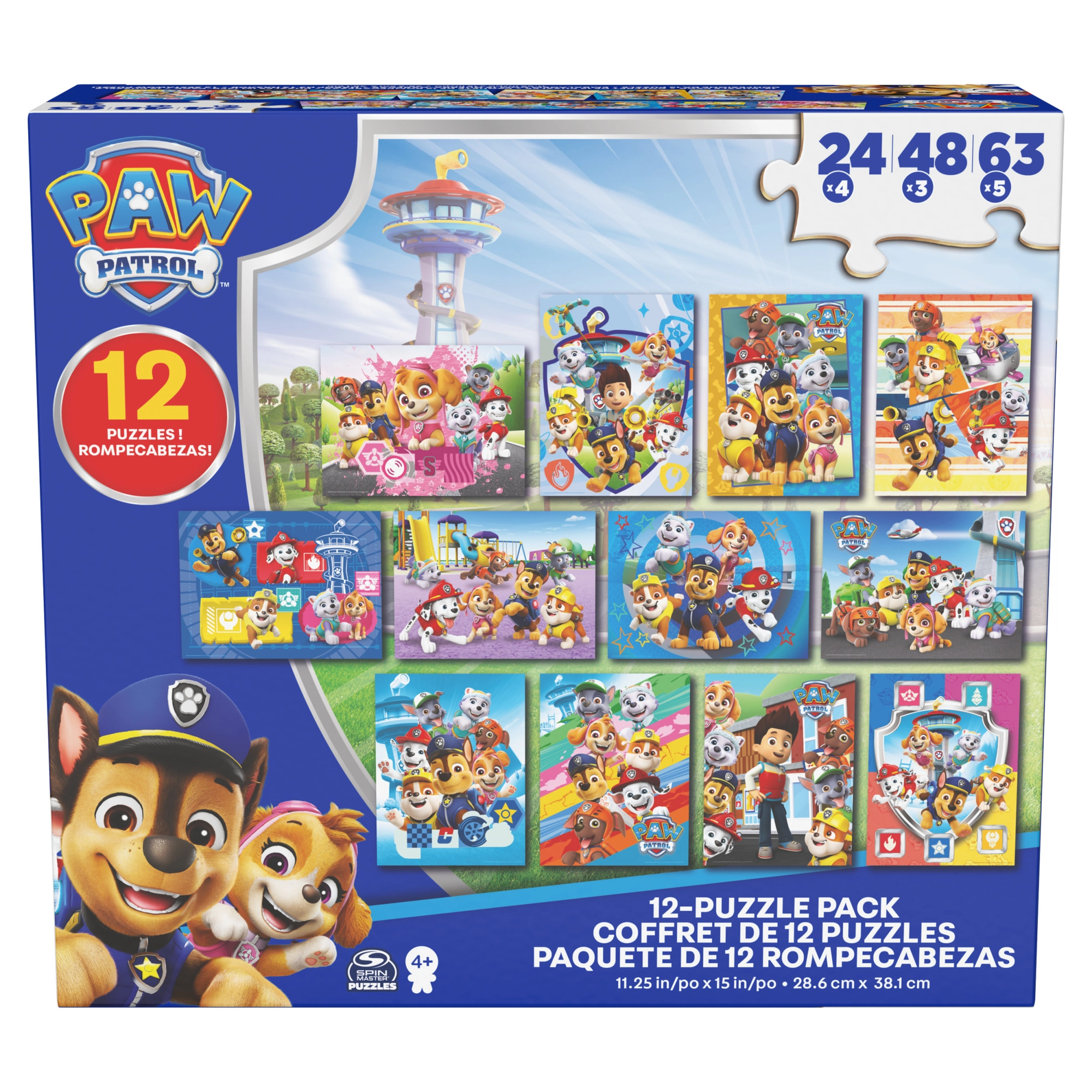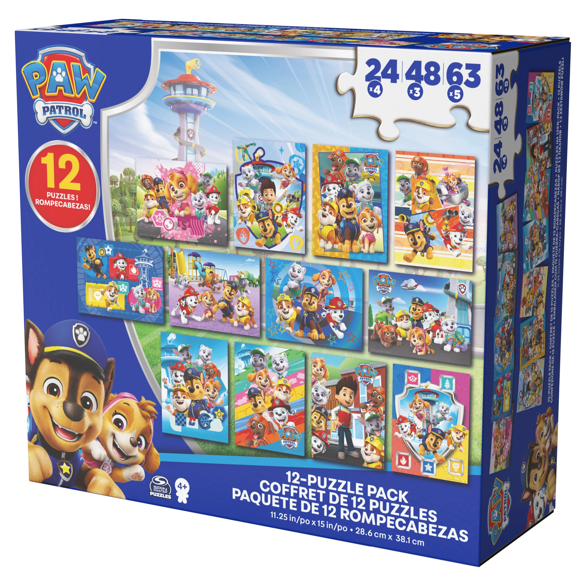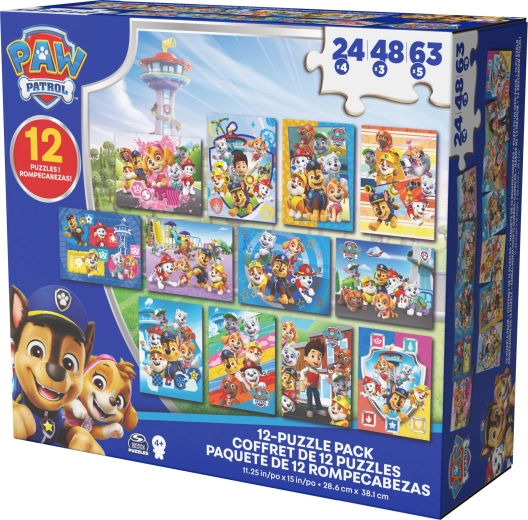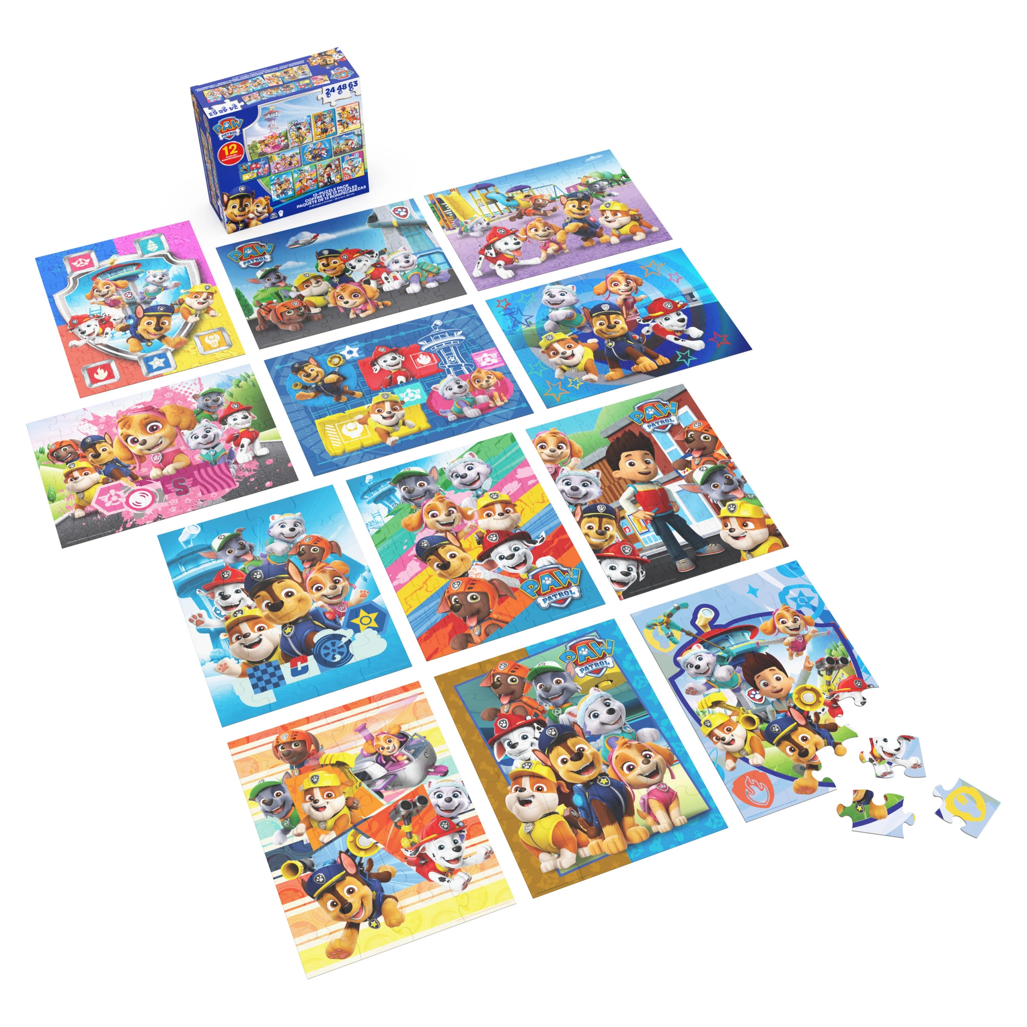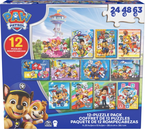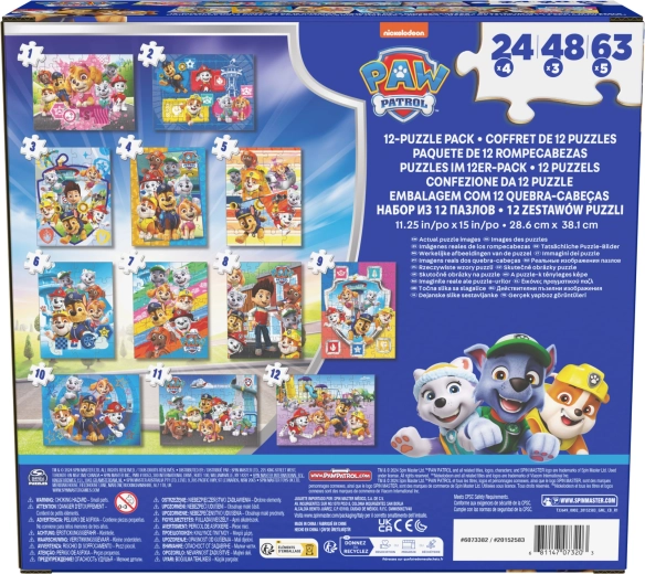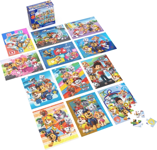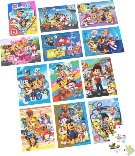 In de doos vind je 12 puzzels met verschillende moeilijkheidsgraden: 4× 24 stukjes, 3× 48 stukjes en 5× 63 stukjes. Hierdoor kunnen kinderen van eenvoudigere naar complexere afbeeldingen groeien en stap voor stap hun vaardigheden versterken.