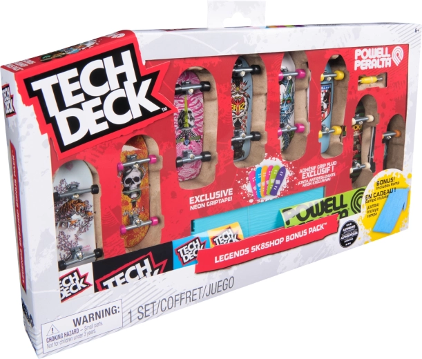 Ontdek de wereld van fingerboarding met het legendarische merk TECH DECK, dat al meer dan 20 jaar fans over de hele wereld inspireert. Deze exclusieve set Legends Sk8shop Bonus Pack biedt 8 kant‑en‑klare fingerboards met kleurrijke designs en een neonramp voor sprongen en trucs.
