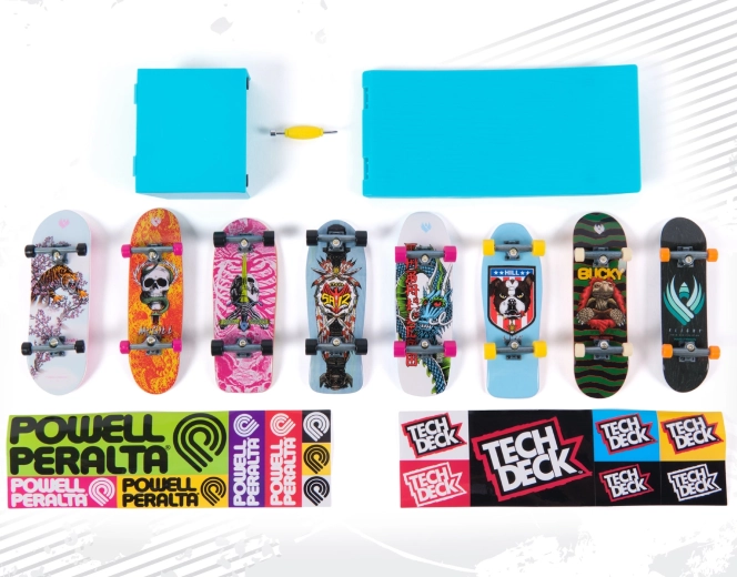 De set bevat acht complete fingerboards met opvallende kleurrijke prints en realistische trucks en wieltjes. Perfect voor de collectie én voor dagelijks rijden.