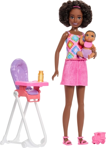 Ontdek de speelset BARBIE Skipper Oppas met een schattige baby en een functionele kinderstoel. Kinderen genieten van realistische verzorgings- en voerscènes dankzij de vele accessoires – flesje, kommetje, lepeltje, slabbetje en een speelgoedtrein. De pop heeft beweegbare ledematen en een moderne outfit, wat creatief verhalen vertellen stimuleert vanaf 3 jaar.