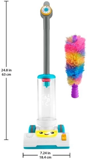 Speelse 2-in-1 kinderspeelgoedstofzuiger van Fisher-Price met licht- en geluidseffecten, afneembare handveger en 2 leerstanden met meer dan 45 melodieën, geluiden en zinnen. Ondersteunt de ontwikkeling van de motoriek, leert het alfabet, kleuren, tellen 1–10 en eenvoudige tegenstellingen en motiveert kinderen tot actieve spel door volwassenen na te doen.