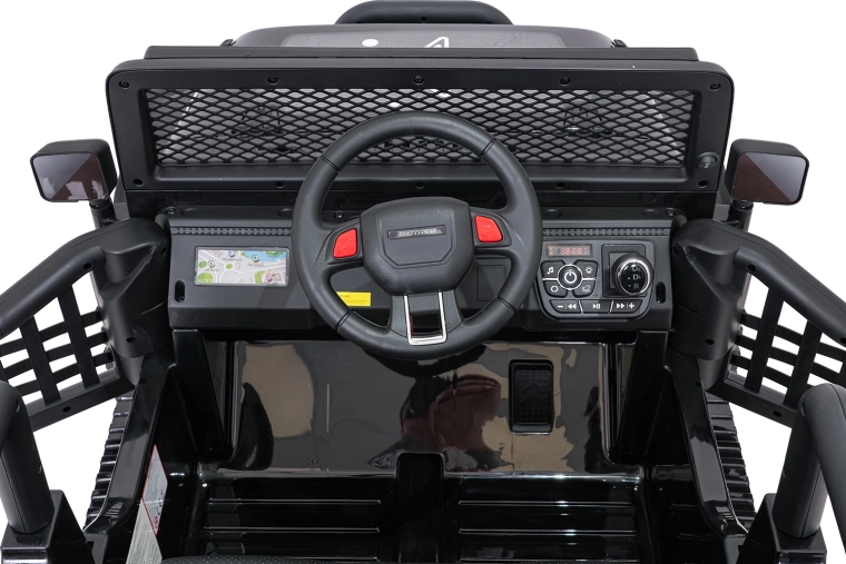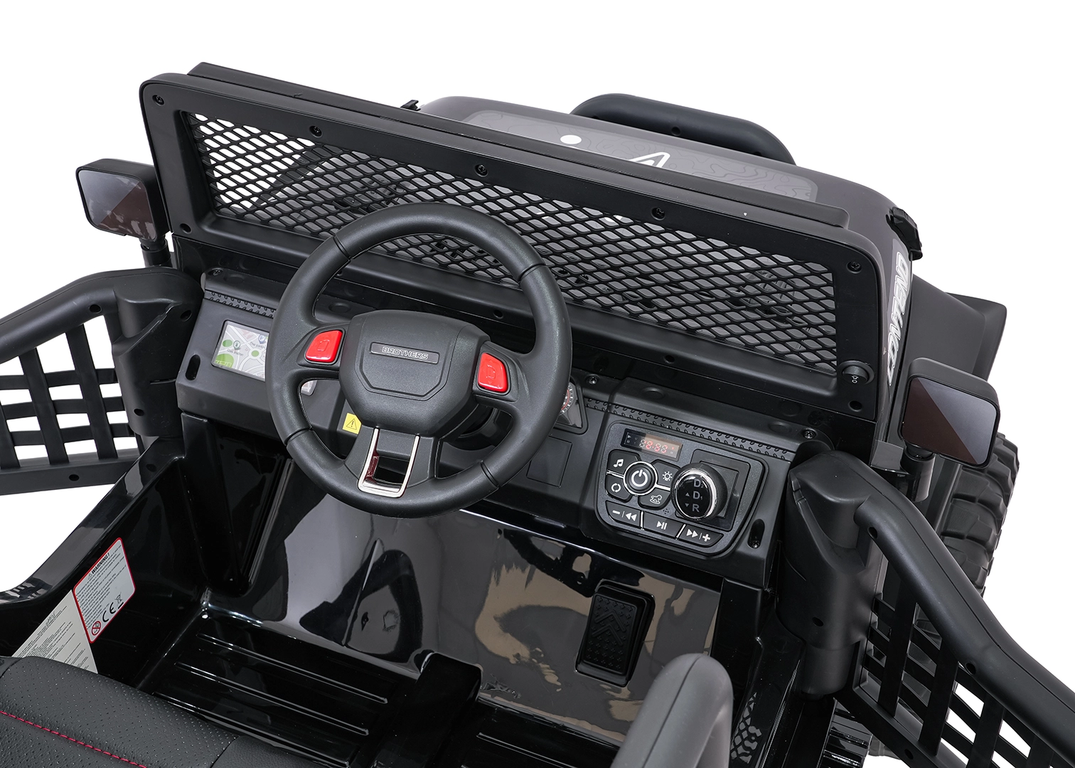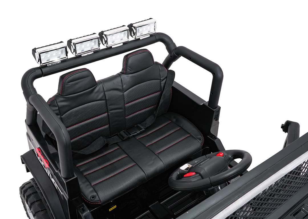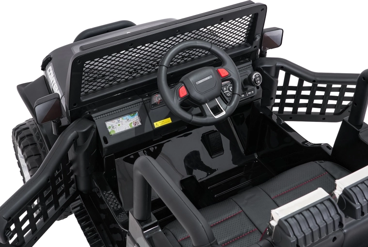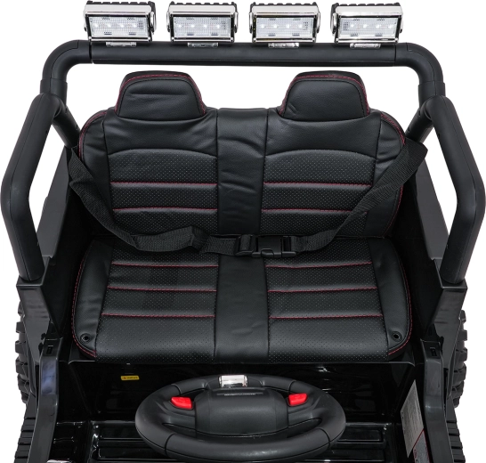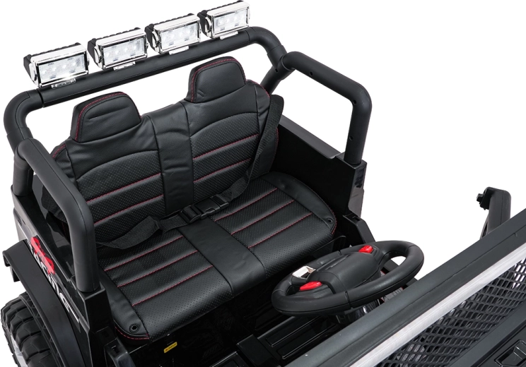 De dubbele zitting van eco-leder met veiligheidsgordels biedt ruimte en comfort. Ouders waarderen de 2,4GHz afstandsbediening met drie snelheden en noodknop Stop. Jonge bestuurders zullen plezier hebben met het multimediapaneel met FM-radio, MP3, USB, AUX en Bluetooth, knoppen voor geluiden en claxon op het stuur en een batterijniveau-indicator.