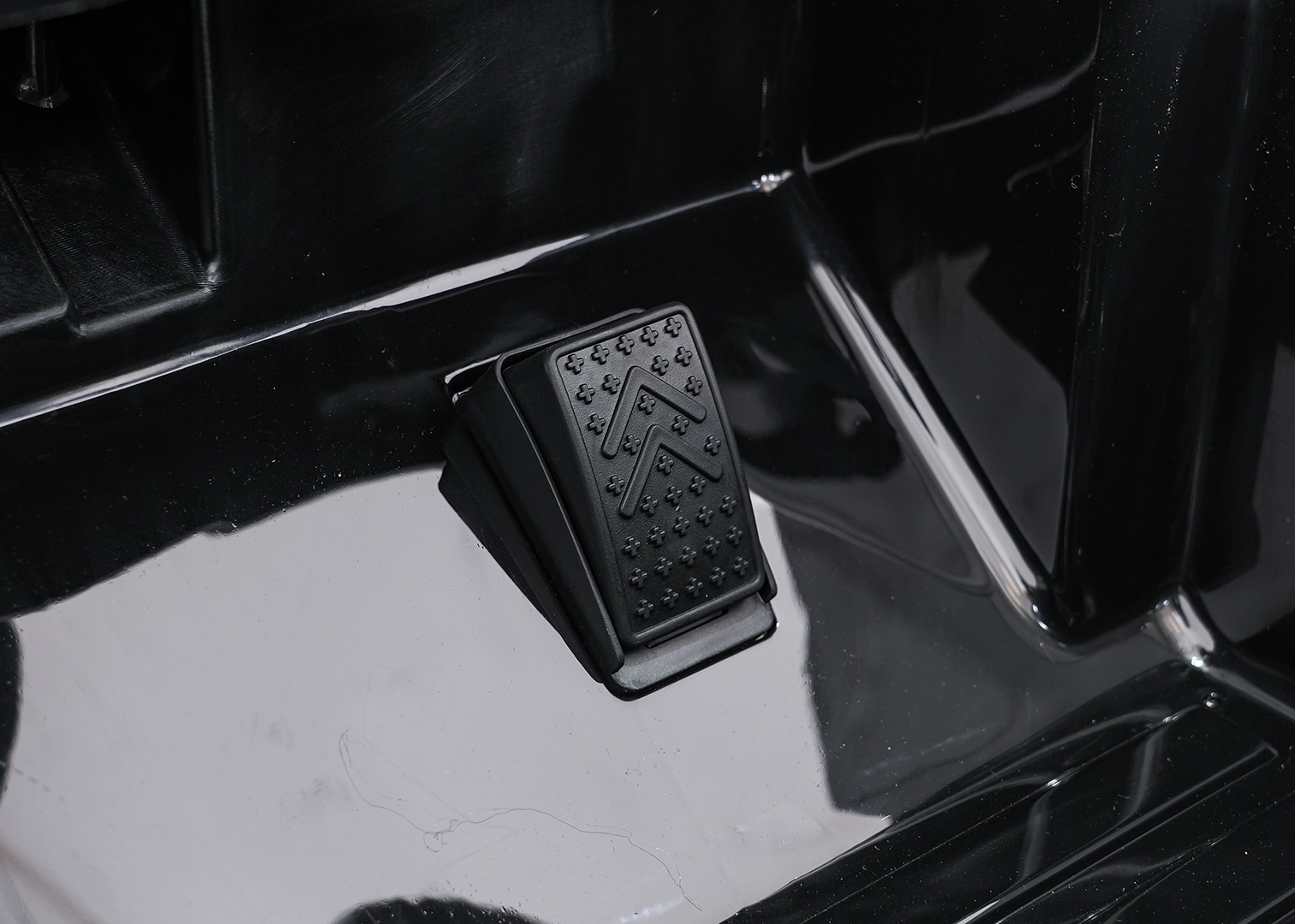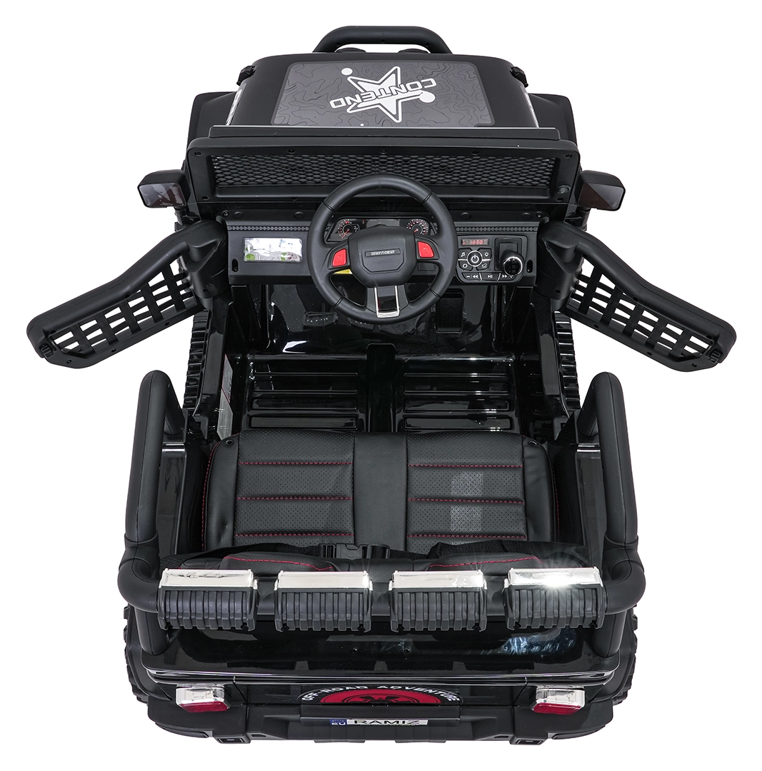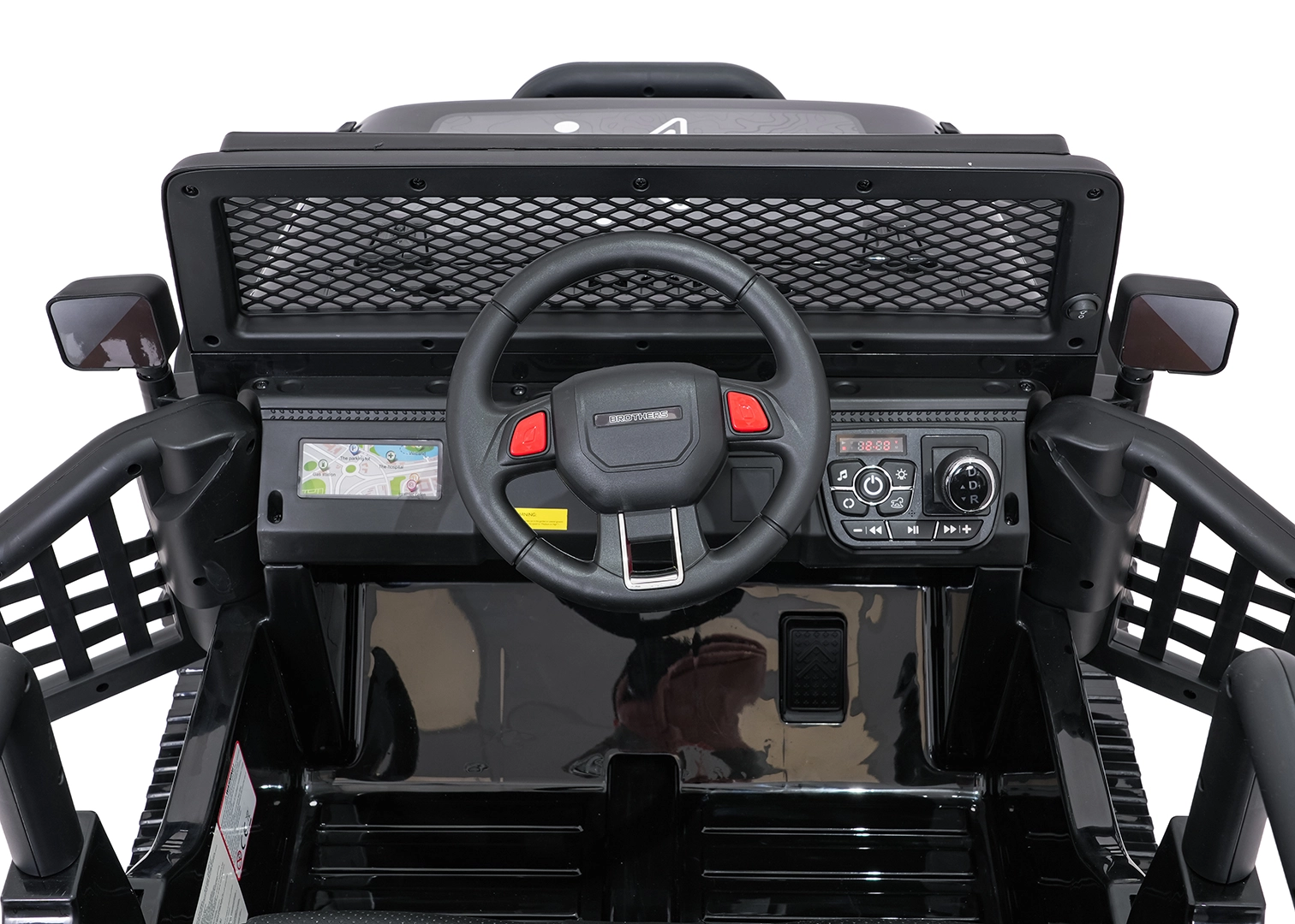 De dubbele zitting van eco-leder met veiligheidsgordels biedt ruimte en comfort. Ouders waarderen de 2,4GHz afstandsbediening met drie snelheden en noodknop Stop. Jonge bestuurders zullen plezier hebben met het multimediapaneel met FM-radio, MP3, USB, AUX en Bluetooth, knoppen voor geluiden en claxon op het stuur en een batterijniveau-indicator.