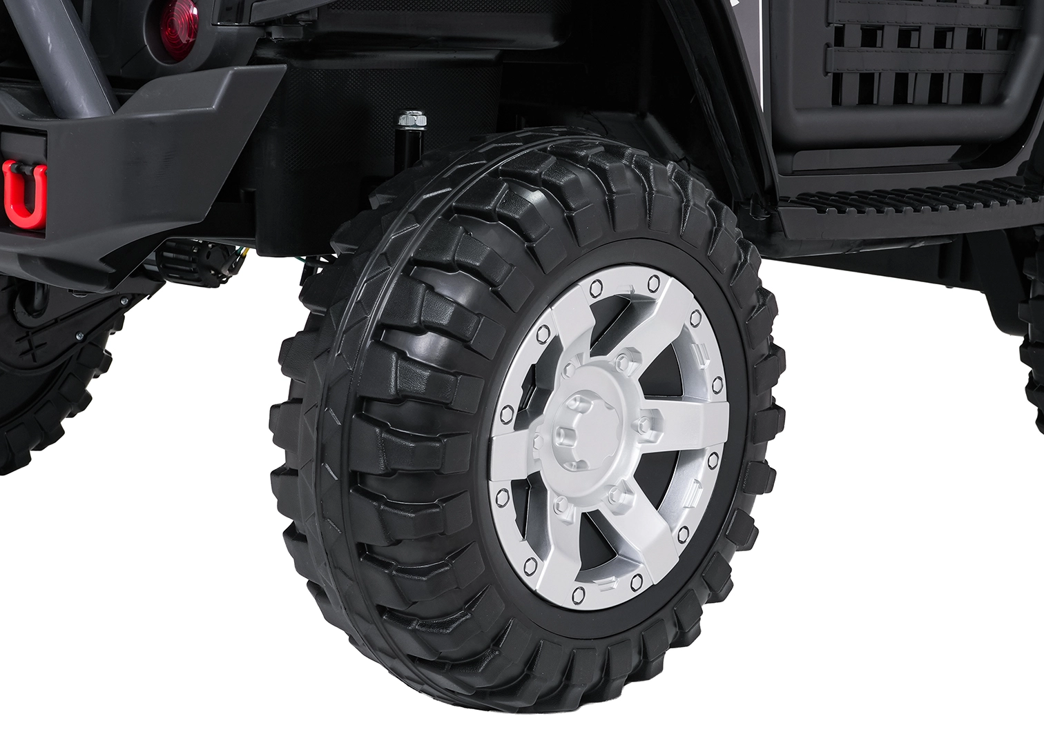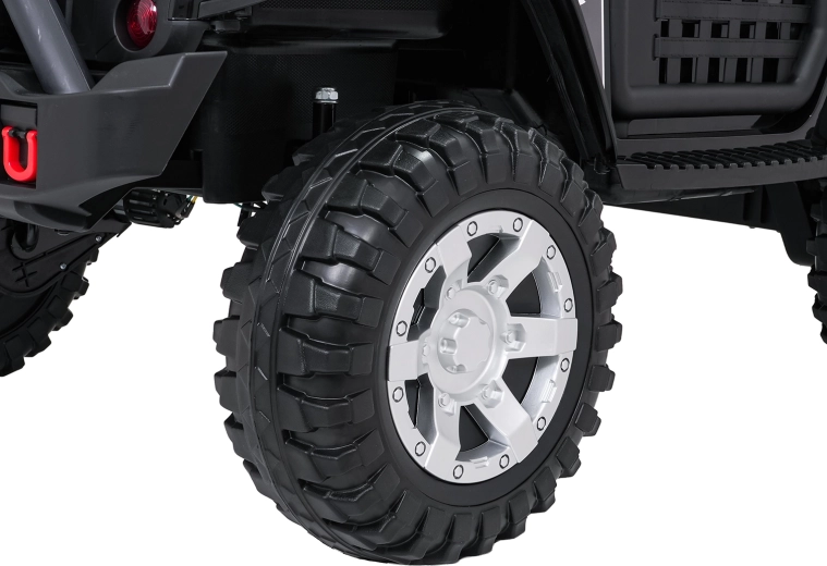 Robuuste elektrische kinderauto in offroad-jeepstijl met een krachtige 4x4-aandrijving (4×45 W), dubbele accu 2× 12 V 7 Ah, zachte EVA-wielen en voor- en achtervering voor comfortabel rijden. Voor veiligheid en plezier zorgen de 2,4GHz afstandsbediening met Stop-knop, LED-verlichting en een uitgebreid audiopaneel met Bluetooth, MP3 en FM-radio.