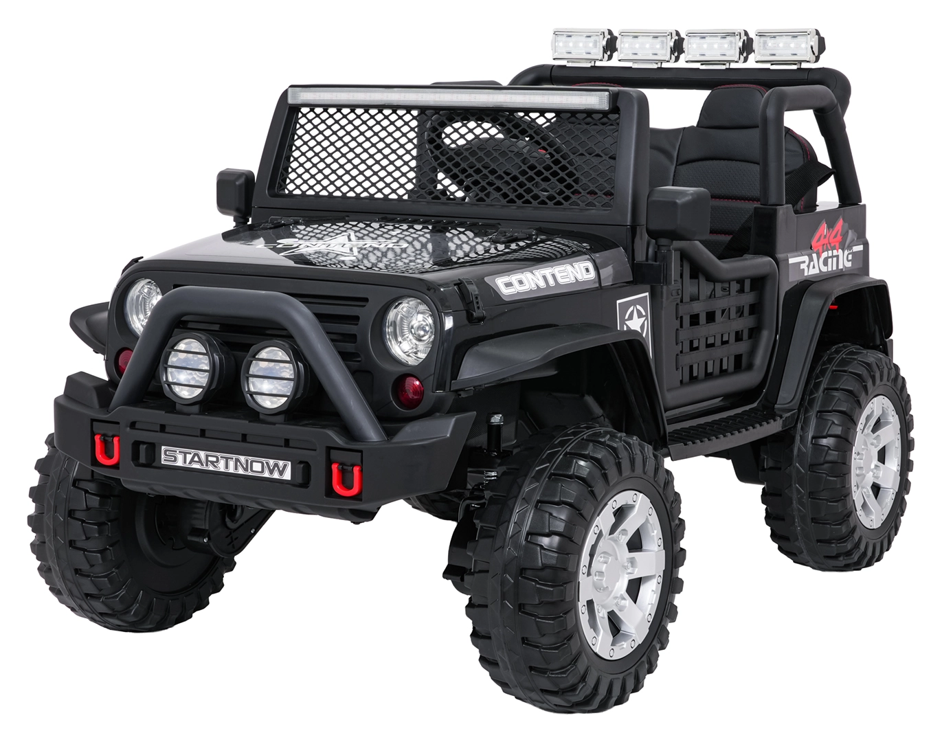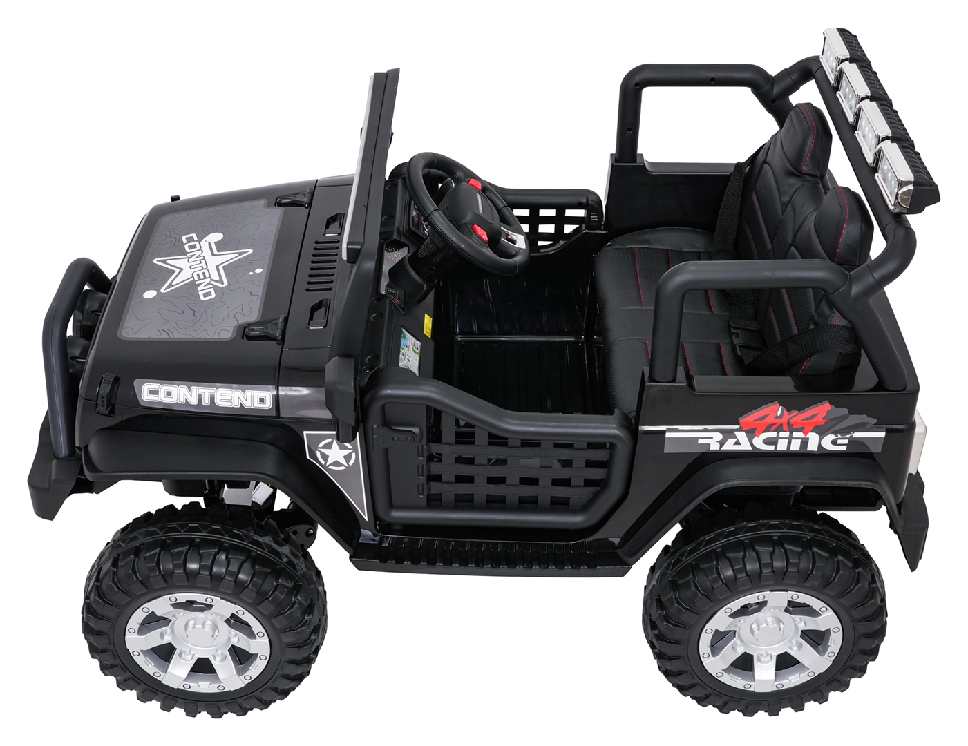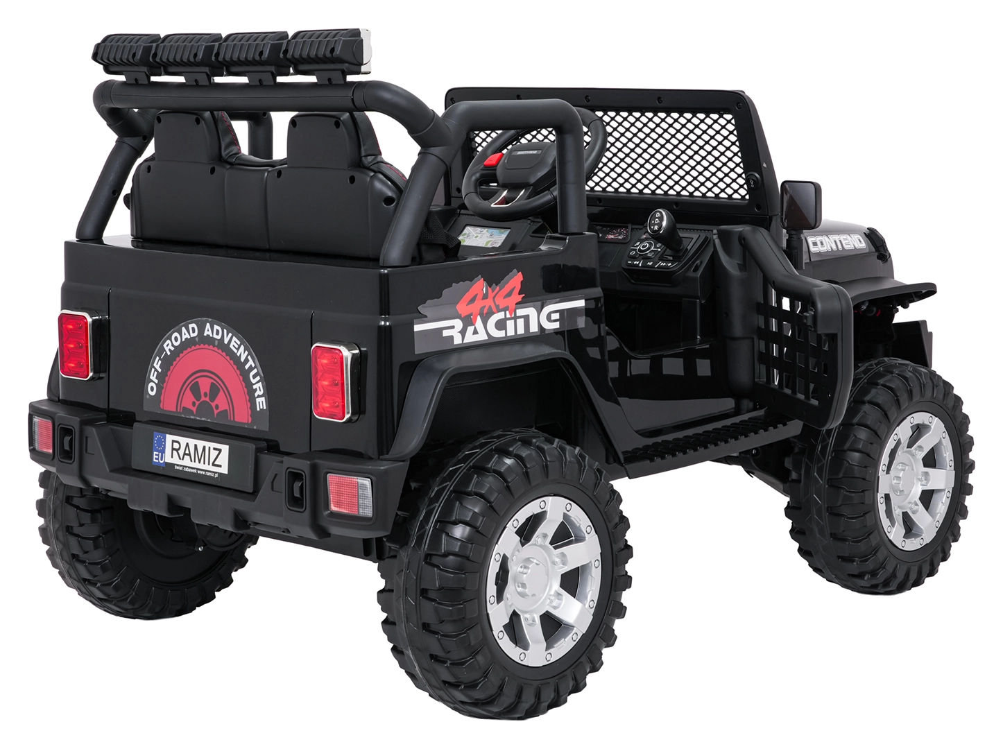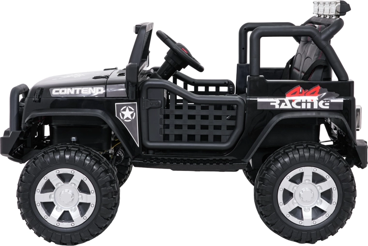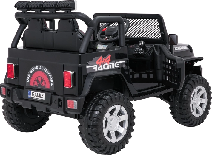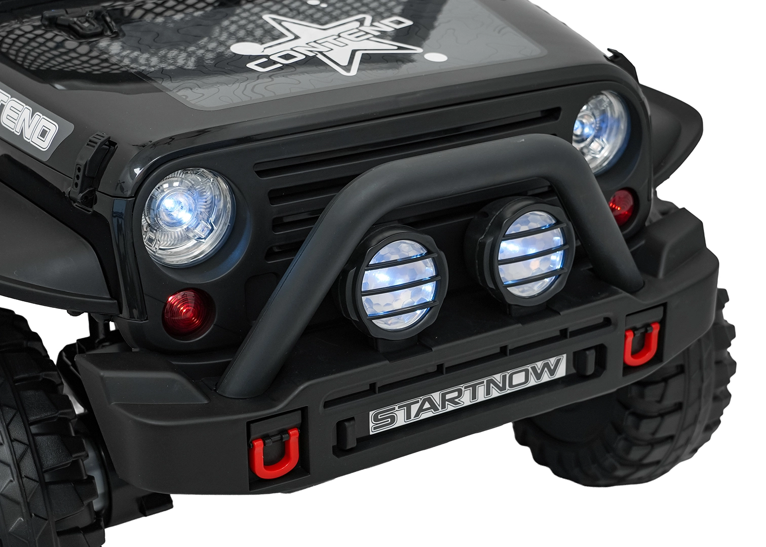 Deze zwarte offroad-kampioen is gemaakt voor avontuur. Dankzij vierwielaandrijving 4x4, hoge bodemvrijheid en zachte EVA-wielen kan hij moeiteloos over oneffen terrein en door de tuin rijden. Soepel starten, twee snelheden en rijden vooruit/achteruit zorgen voor comfortabel en veilig bedienen. LED-verlichting (voor, achter en daklampen) geeft een realistische look en betere zichtbaarheid.