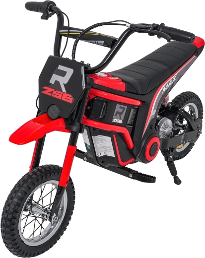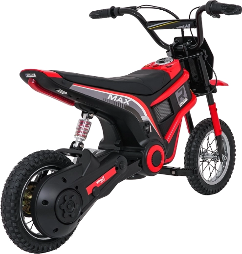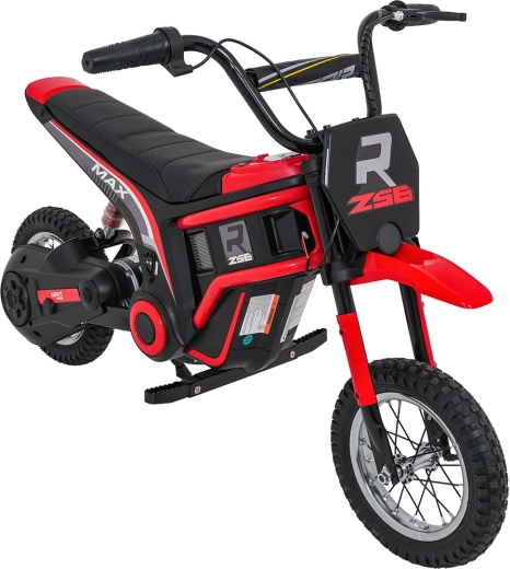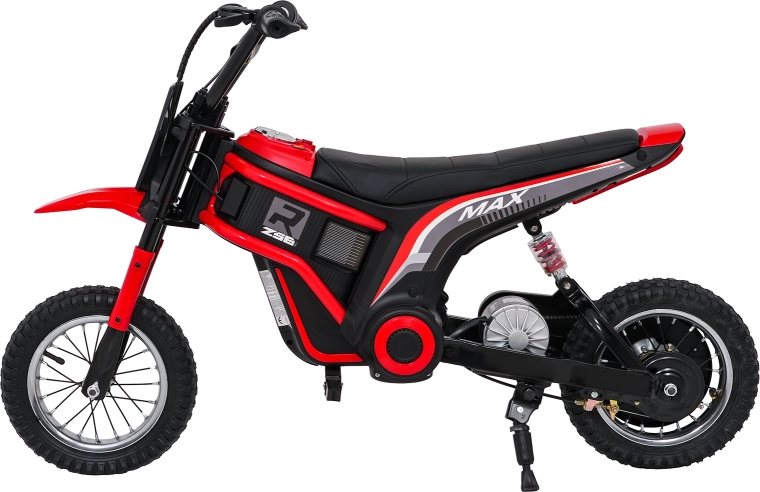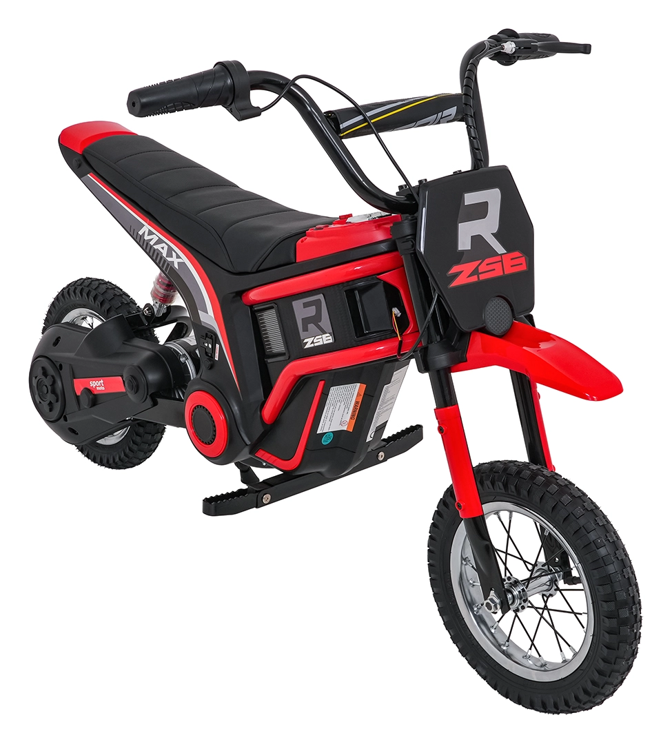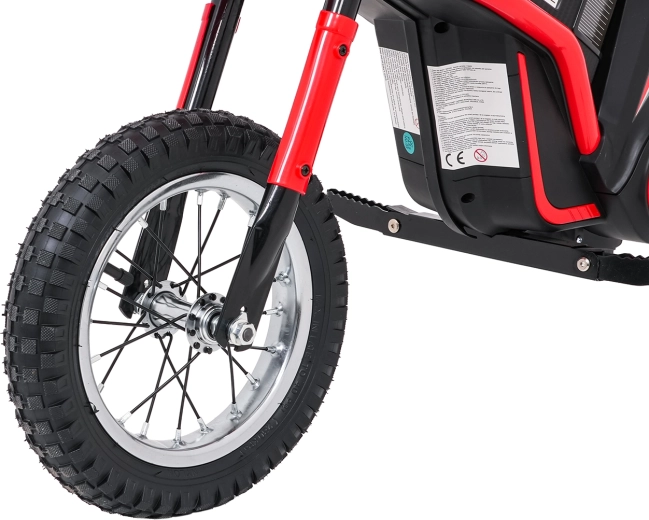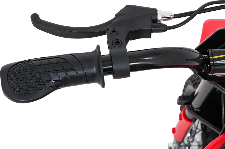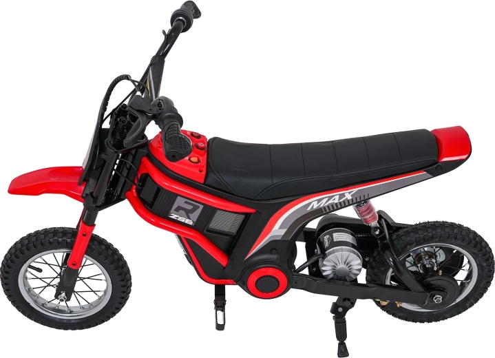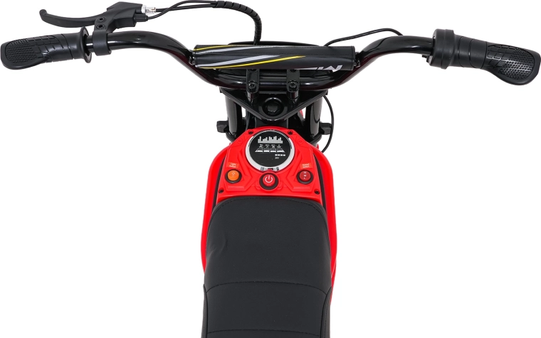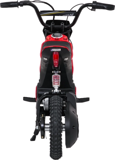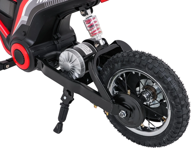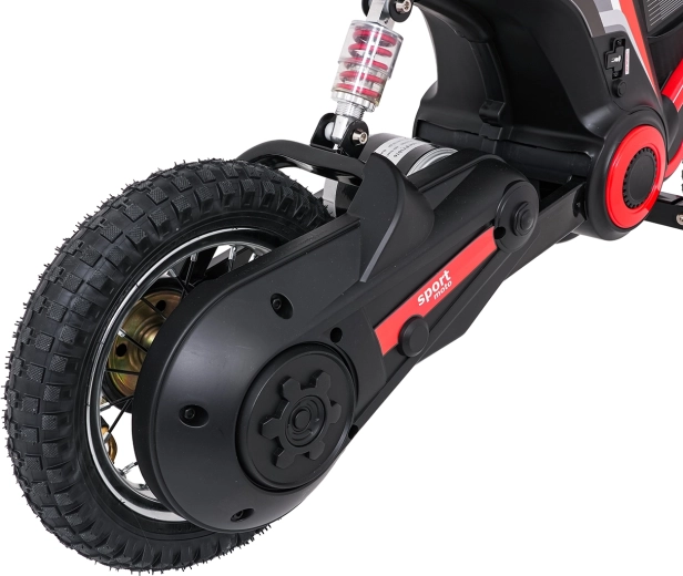 De stijlvolle elektrische kindermotor RZ56 MAX in het rood biedt een krachtige 350W-motor met kettingaandrijving, een 24V-accu (2× 12V 10Ah) en drie snelheidsstanden voor veilig rijplezier. Dankzij de opblaasbare terreinbanden, achtervering en LED-verlichting rijdt hij ook comfortabel op oneffen ondergrond. Het comfortabele zadel van eco-leer, soepele wegrijfunctie en audiopaneel met Bluetooth zorgen voor gemak en rijplezier.