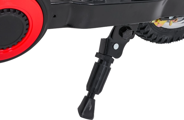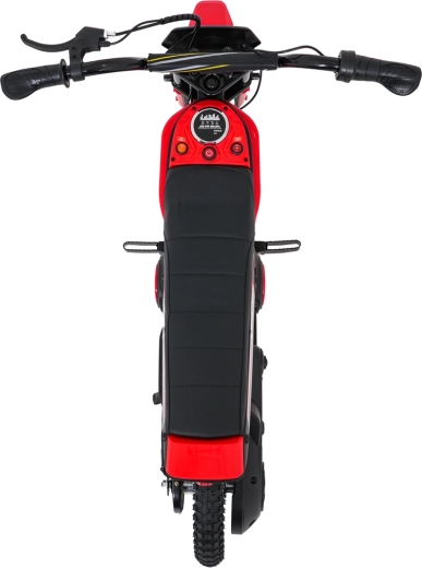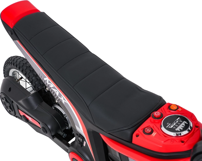 De krachtige 24V-accu (2× 12V 10Ah in serie) voedt een 350W-motor met kettingaandrijving. De rijder kan kiezen uit drie snelheden (L/M/H) en dankzij ergonomische handvatten en hendels op het stuur verlopen wegrijden en remmen gecontroleerd. Het zadel van eco-leer (49 × 15 cm) biedt comfort, ook bij langere ritten, en het robuuste frame draagt tot 65 kg.