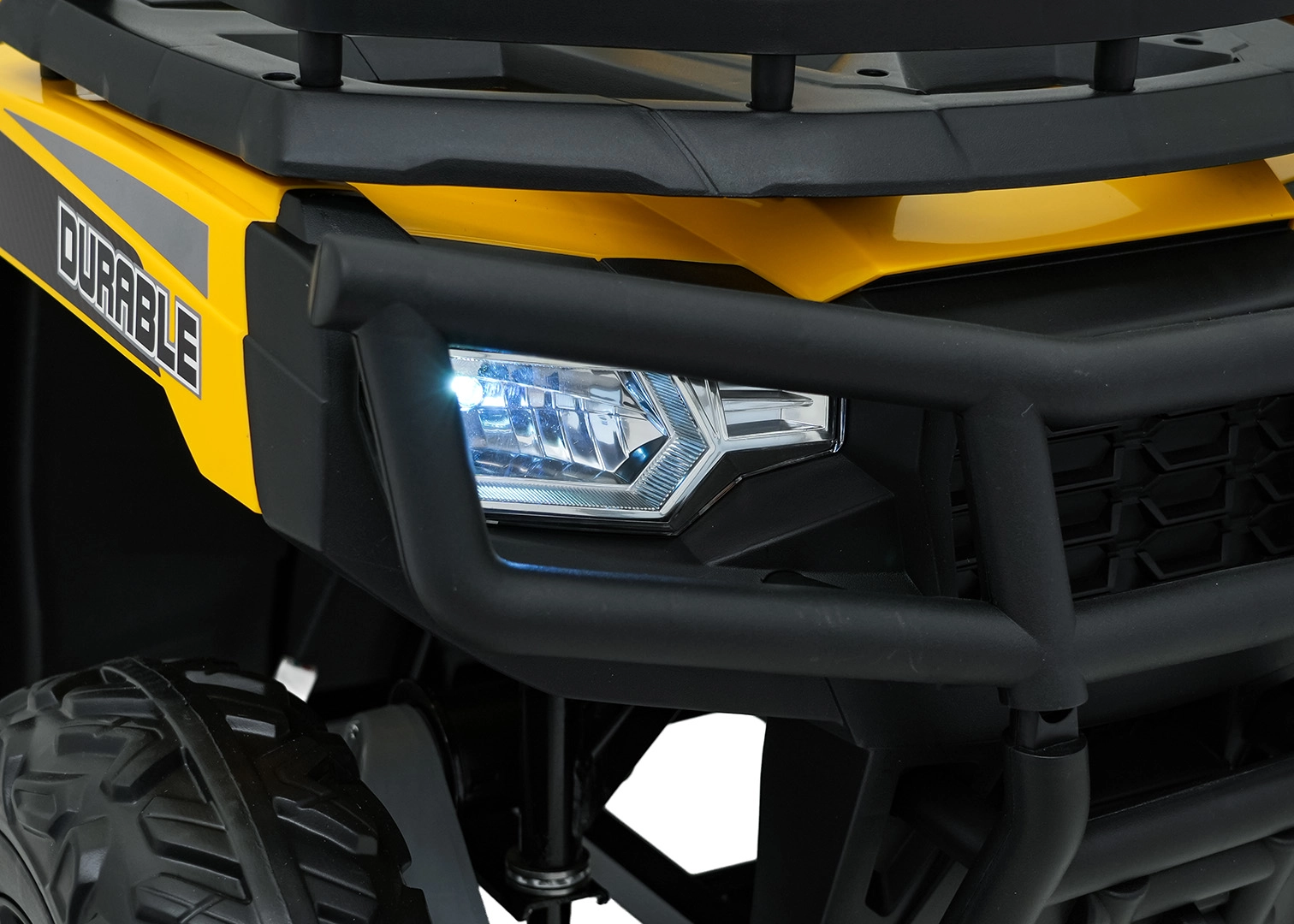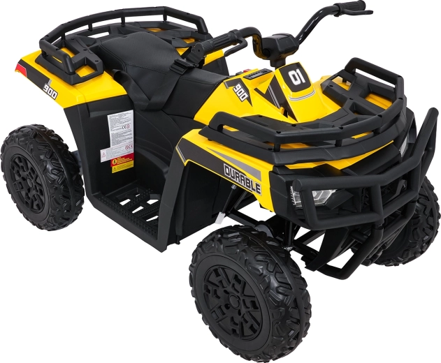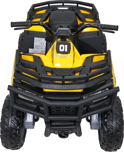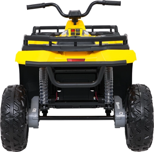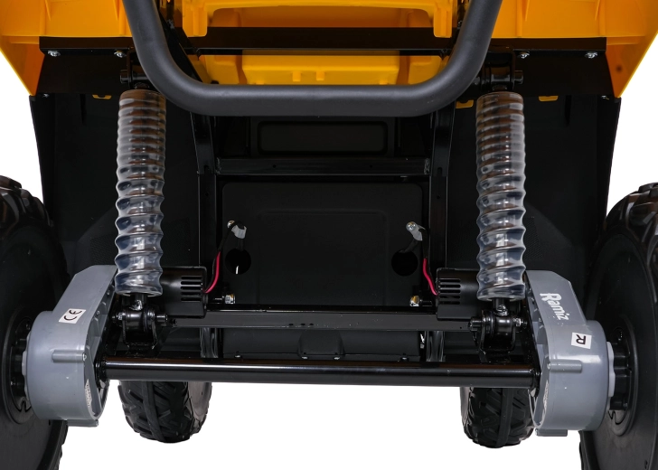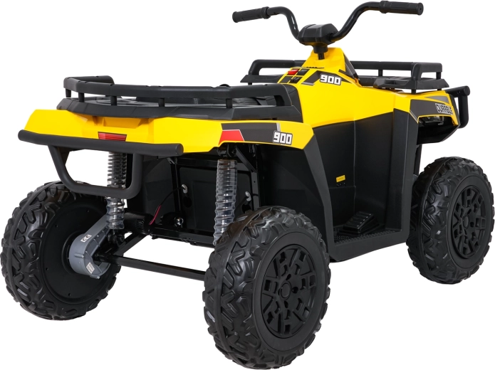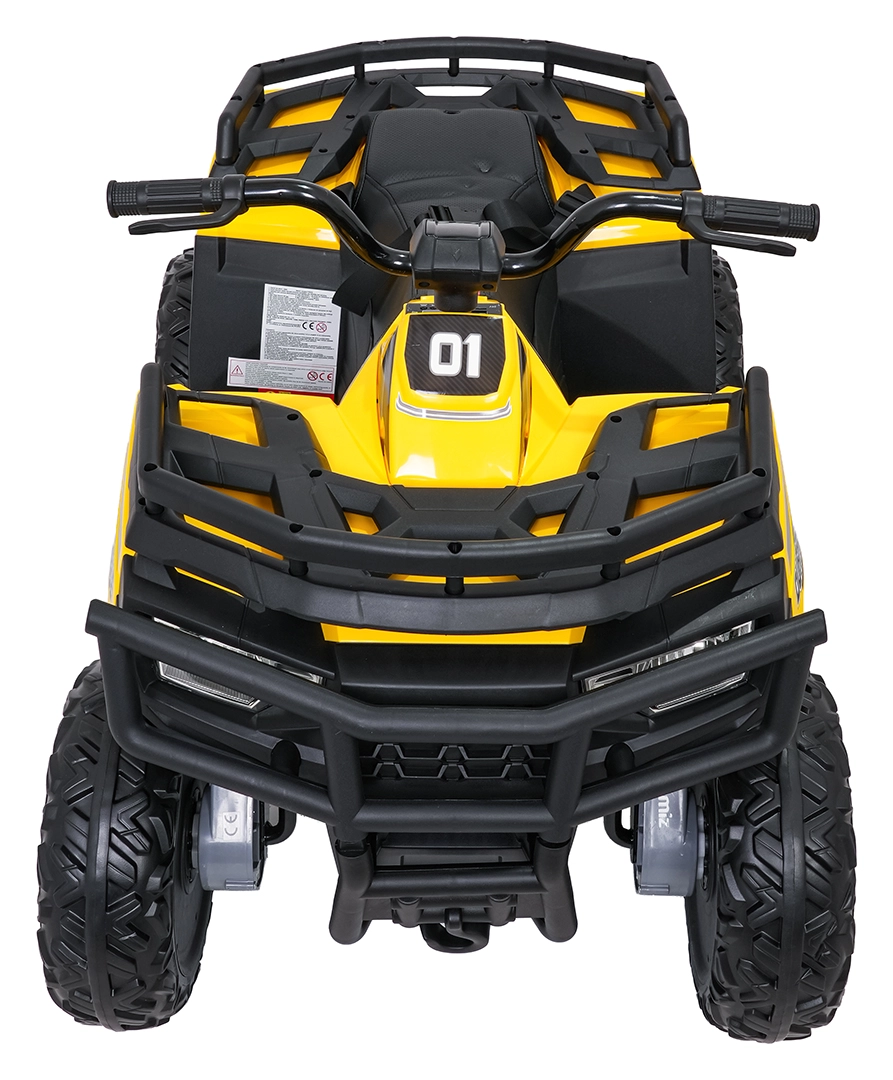 De gele elektrische kinderquad WOLF 4x4 biedt een echte offroad-ervaring dankzij vier afzonderlijke 200 W motoren, die trekkracht in het terrein en zekerheid op oneffenheden garanderen. Grote EVA-banden met diep profiel zorgen voor uitstekende grip en stille rit, terwijl de voorste LED-lampen de zichtbaarheid verbeteren en voor een realistische look zorgen.