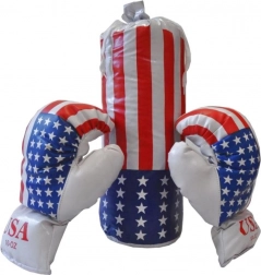De handschoenen hebben een maat die perfect geschikt is voor kleine kinderhanden. Zak en handschoenen met motieven van de Amerikaanse vlag zullen elke kleine strijder vermaken. Het speelgoed is gemaakt van zacht materiaal, dus u hoeft zich geen zorgen te maken over mogelijke verwondingen. Het ontwikkelt kinderbekwaamheid en verbeeldingskracht en stimuleert gezonde beweging bij het kind.