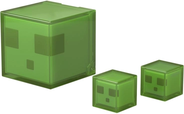 Transparante groene slimes met gepixelde gezichten kun je stapelen en uitstallen. De verschillende formaten brengen je diorama’s en actiescènes tot leven.