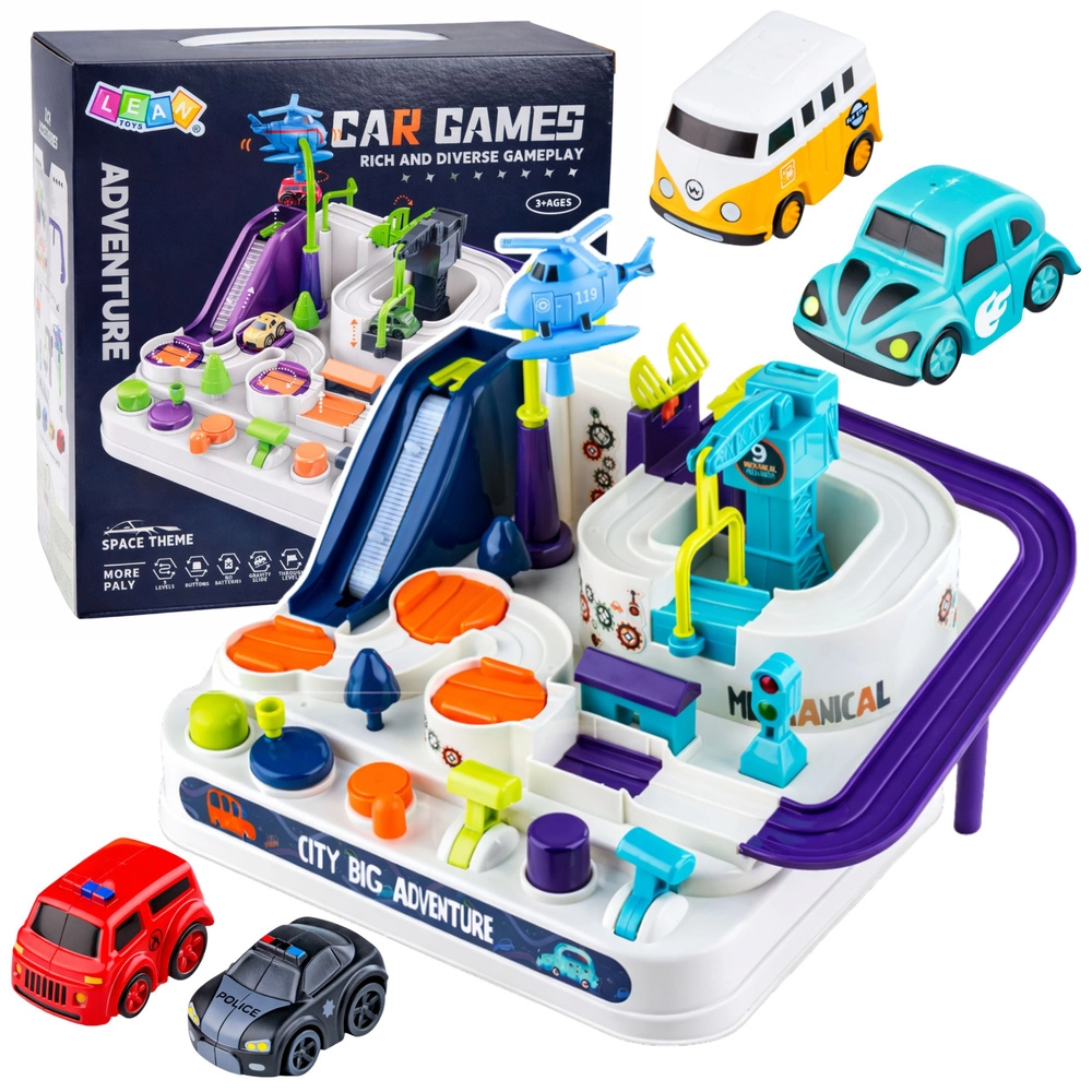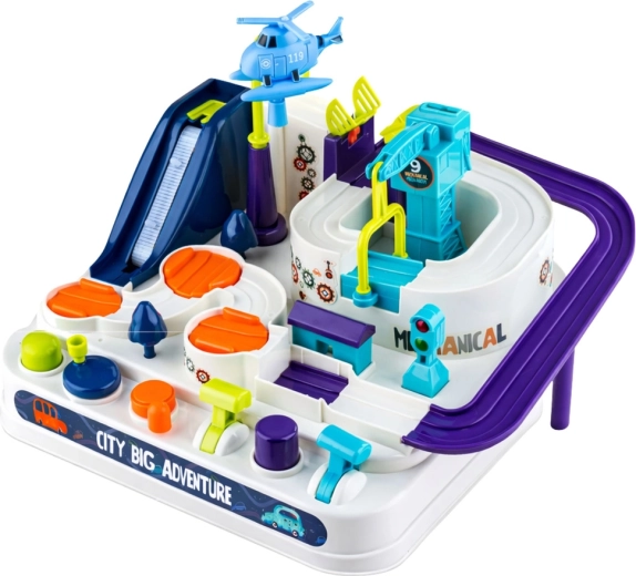Deze interactieve stedelijke set is niet zomaar een racebaan. Kinderen sturen zelf de rit van de autootjes met behulp van hendels, knoppen en tandwielen, overwinnen de lift, brug, kraan en roterende elementen en leren de volgende stap te plannen. Dankzij de volledig mechanische en op zwaartekracht gebaseerde werking zijn er geen batterijen nodig.