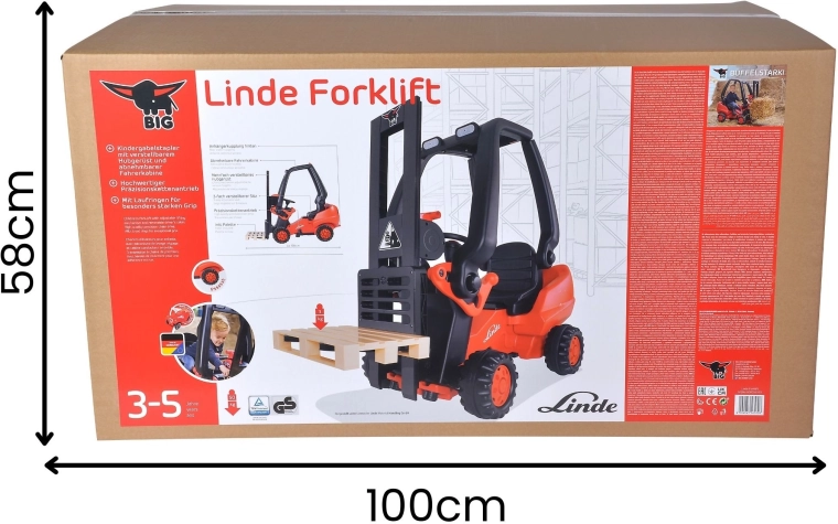 De trapheftruck BIG LINDE Forklift verandert elke tuin in een kleine bouwplaats. Realistische details, zoals bewegende vorken met een draagvermogen tot 3 kg en de meegeleverde pallet, stimuleren de fantasie en ontwikkelen de grove motoriek. Dankzij de kettingaandrijving hebben kinderen alles onder controle en kunnen ze eenvoudig manoeuvreren en de “lading” verplaatsen.