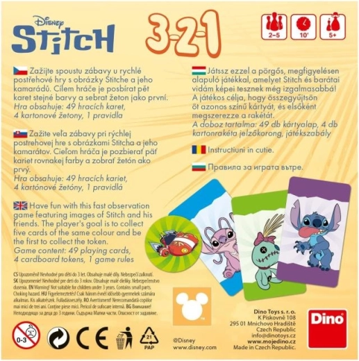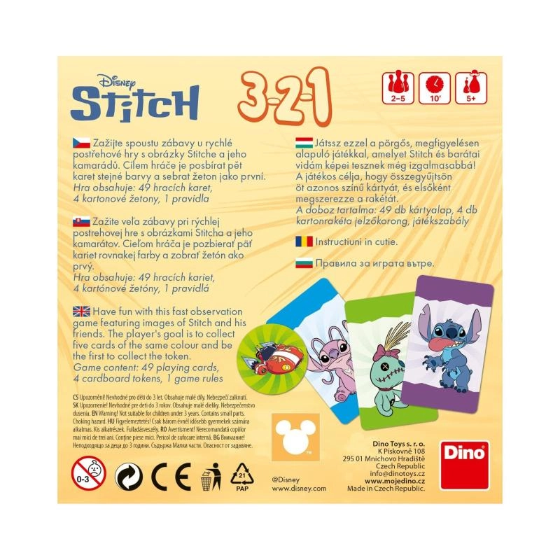 Op zoek naar een vlot en eenvoudig te begrijpen spel voor op reis? Het 3-2-1 STITCH reiskaartspel brengt kleurrijk speelplezier met de favoriete helden STITCH en Angel. Het doel is om zo snel mogelijk vijf kaarten van dezelfde kleur te verzamelen en je tegenstanders voor te blijven.