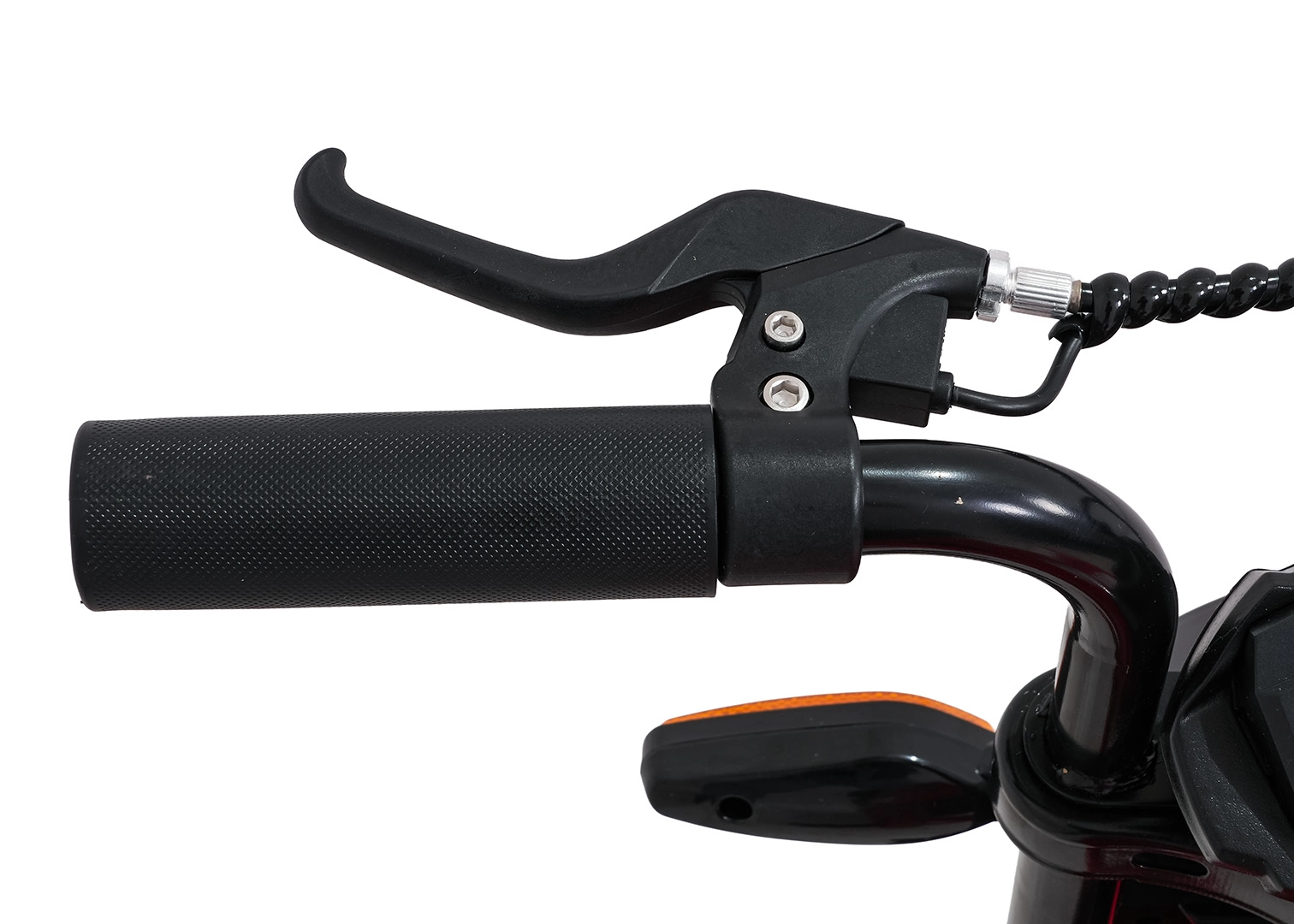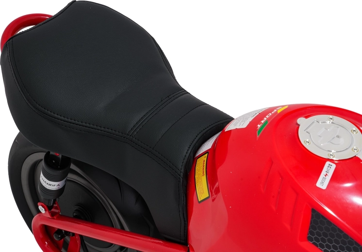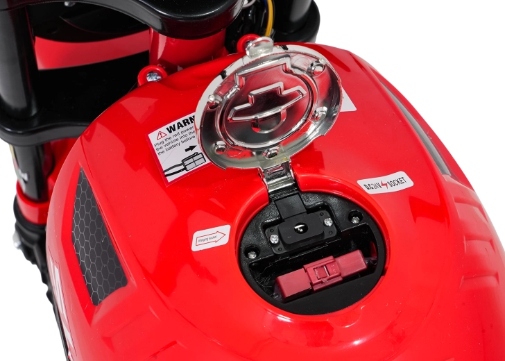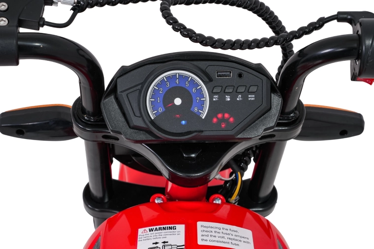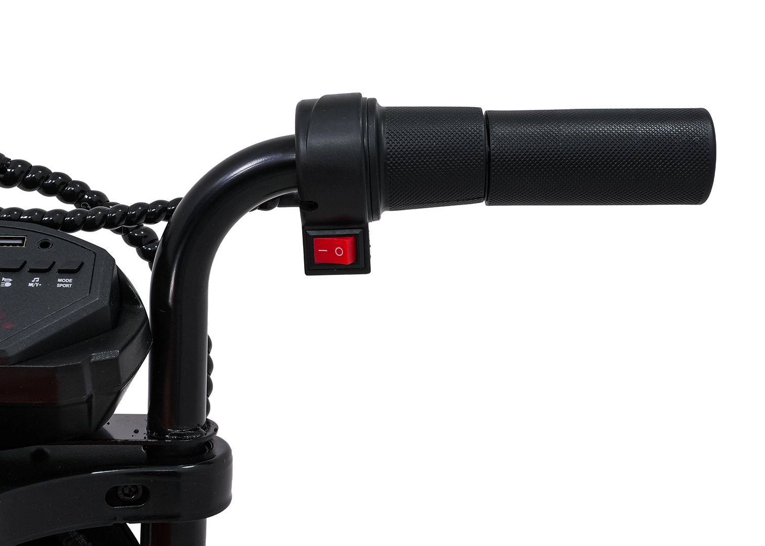 Veiligheid en stijl worden gegarandeerd door de LED-koplampen, richtingaanwijzers en een verlicht dashboard met duidelijke indicatoren. Muziek en geluiden worden bediend via het multimediapaneel met Bluetooth, MP3, AUX, USB, ingebouwde melodieën en een claxon. Starten gaat comfortabel met een knop, terwijl het zadel van zwart eco-leer (30×23 cm) voor extra comfort zorgt.