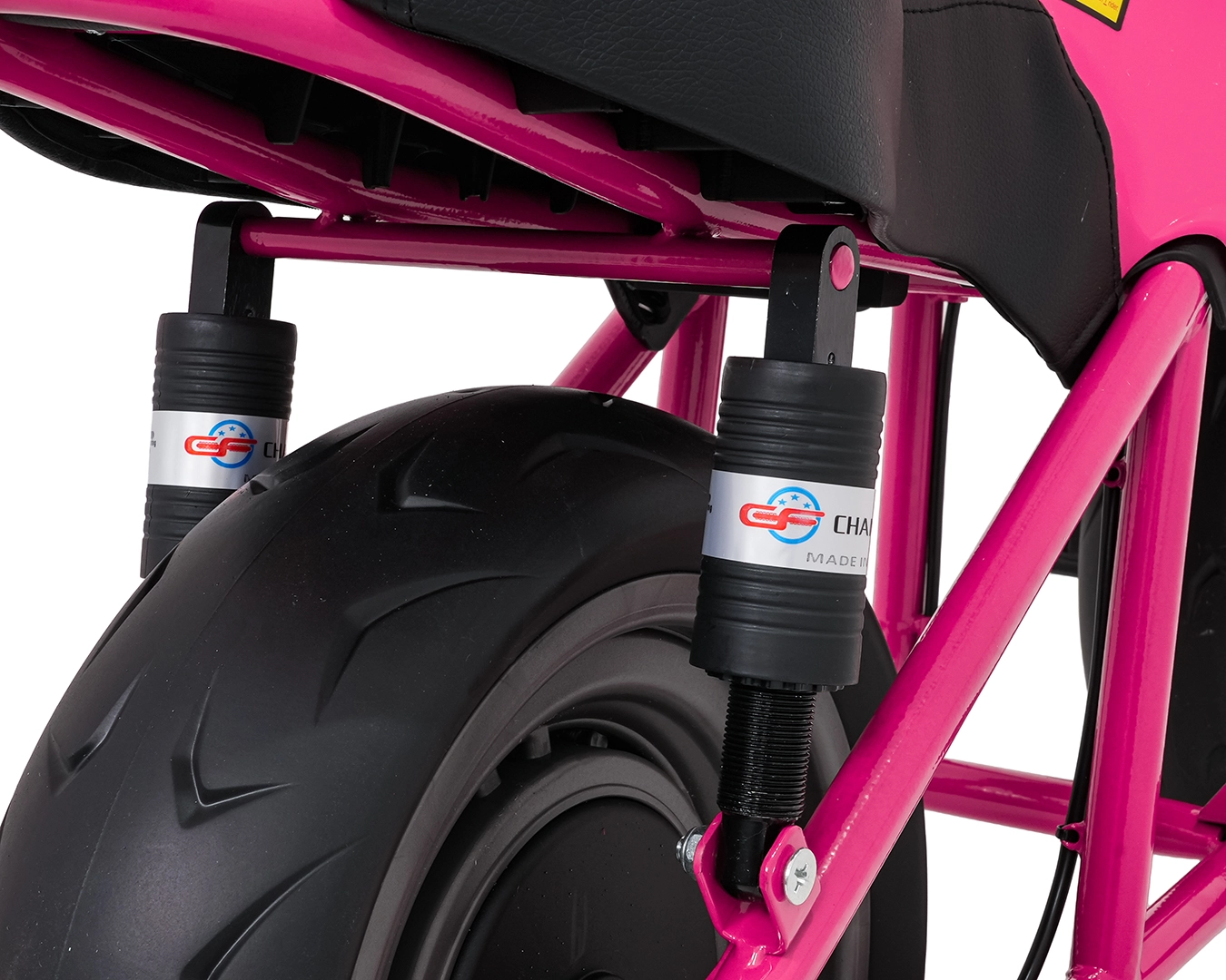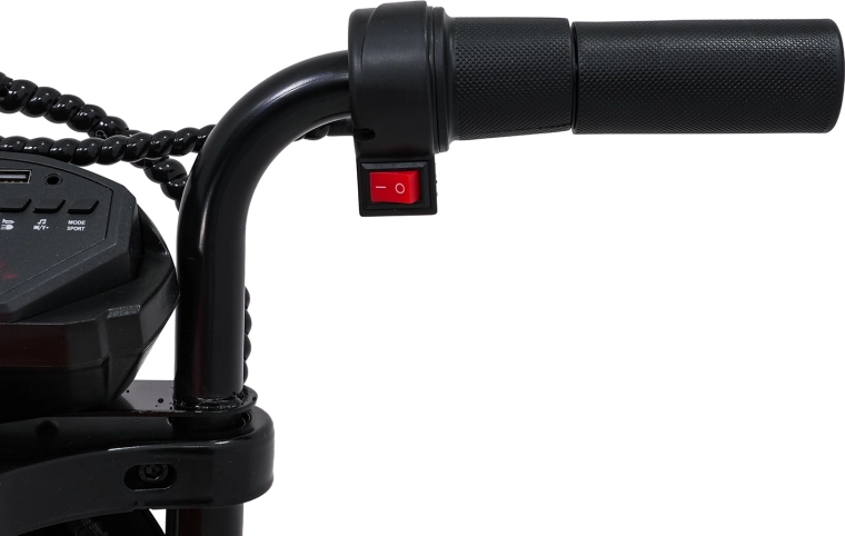 Voor het comfort van het kind is er een zwart zadel van eco-leer (30×23 cm) en dubbele achterdempers met instelbare hardheid. De bediening is intuïtief – aan/uit met knop, een duidelijk instrumentenpaneel en een lichtschakelaar. Het audiopaneel met Bluetooth, USB, MP3 en AUX laat kleine racers genieten van hun favoriete liedjes.