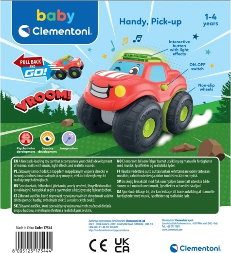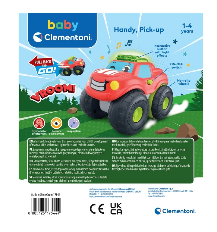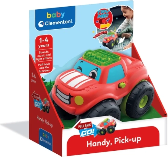 Deze schattige pick-up met een glimlach op de grille maakt elke kleine chauffeur blij. Dankzij de mechanische pull-back-aandrijving hoef je het autootje alleen maar naar achteren te trekken en los te laten – het rijdt vooruit en wekt plezier in beweging en nieuwsgierigheid op. De lichtbalk en realistische geluiden zorgen voor de echte autosfeer tijdens het spelen.