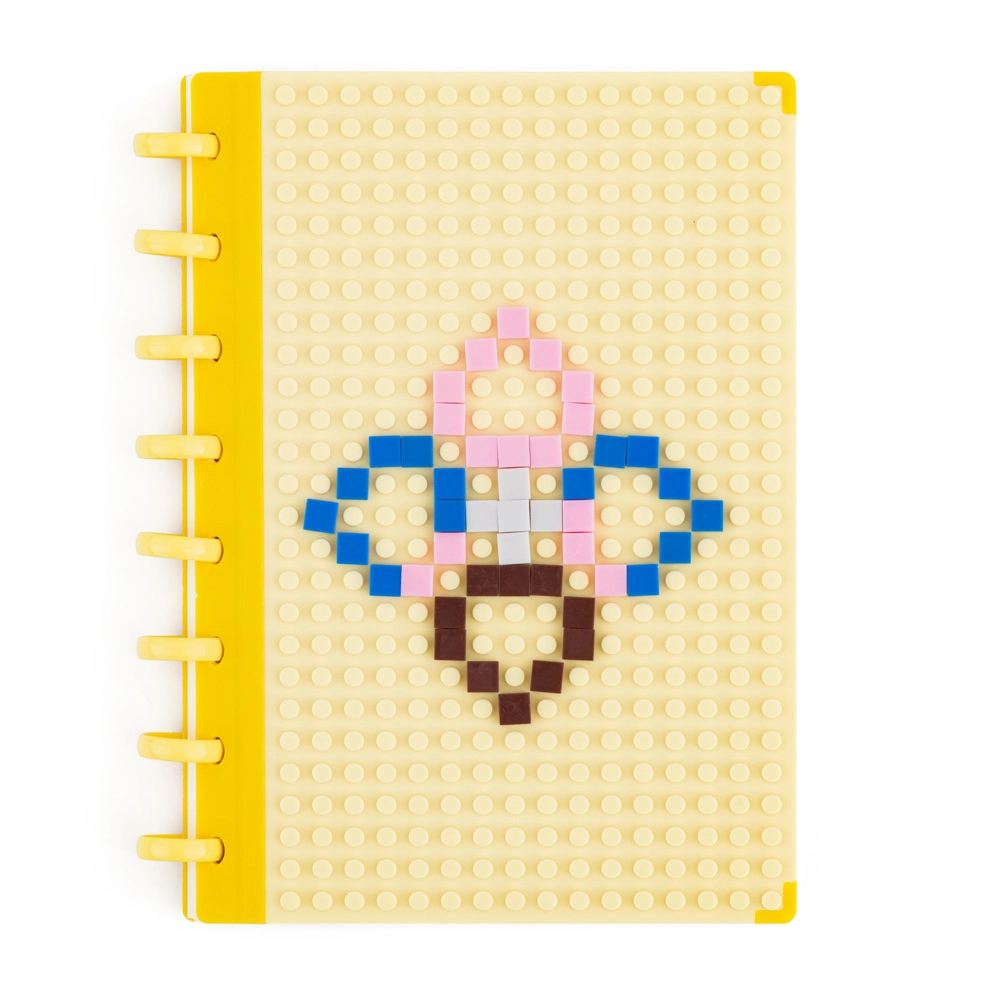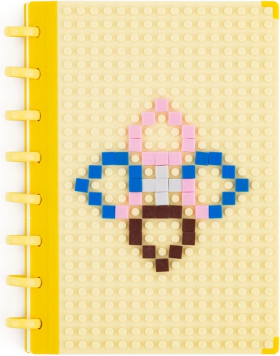 Een speels en praktisch A5-notitieblok met een gele omslag met noppen voor blokjes maakt elk schrijven leuker. Kinderen en creatieve volwassenen kunnen met de meegeleverde blokjes op de omslag een eigen, originele look samenstellen. Het blok biedt 80 gelijnde vellen, een duurzame plastic omslag en een comfortabele ringbinding voor soepel omslaan. In de verpakking zitten 60 blokjes voor eindeloos ontwerpen.