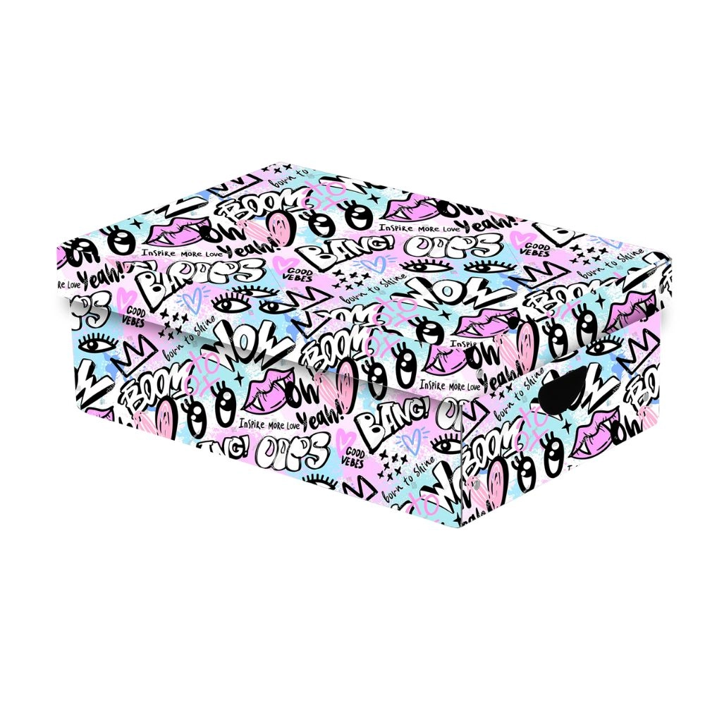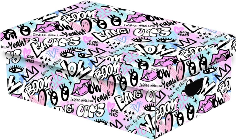 Houd orde met deze ruime doos van duurzaam laminaat die je spullen beschermt tegen stof en beschadiging. Dankzij de praktische uitsparingen voor handgrepen verplaats je haar gemakkelijk overal naartoe. Het "Funny Girl"-design geeft je interieur een speelse en moderne touch.