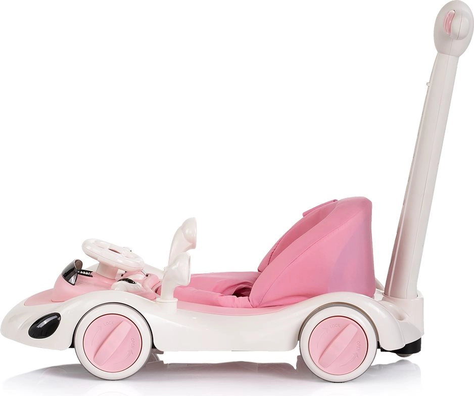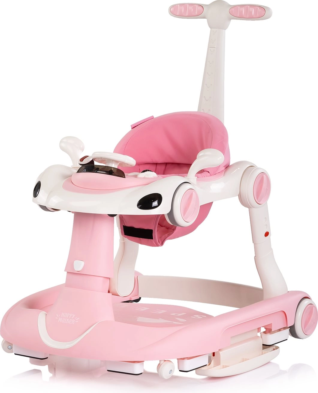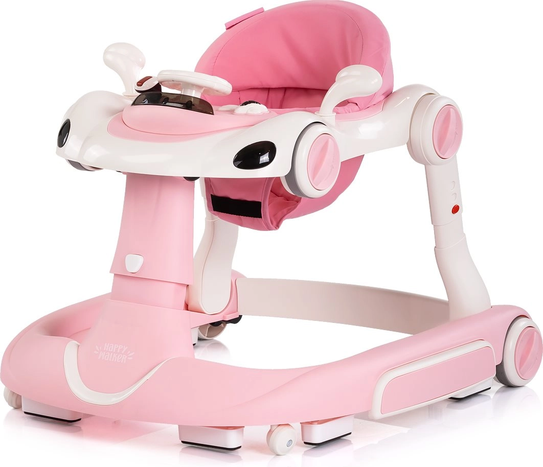De universele 5-in-1 loopstoel CHIPOLINO Happy Walker in roze ondersteunt de eerste stapjes en het speelse ontdekken van de wereld. Biedt een stabiele constructie, een interactief speelpaneel met licht en muziek, verstelbare hoogte en een duwstang voor ouders voor veilig begeleiden. Dankzij de schommel- en springmodus, antislip pads, remmen en vergrendeling van de wieltjes is hij geschikt voor dagelijks gebruik en de ontwikkeling van evenwicht, coördinatie en motoriek.