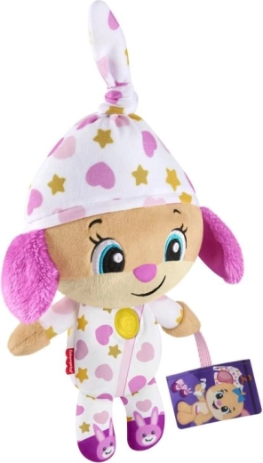 Deze knuffelzachte, kalmerende puppy-zus in pyjama met sterretjes en hartjes is gemaakt voor avondrituelen. Het zacht oplichtende hartje activeert na een druk rustgevende muziek, zachte geluiden en lieve zinnetjes die kinderen helpen af te schakelen.