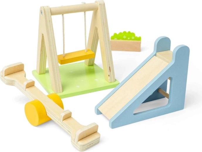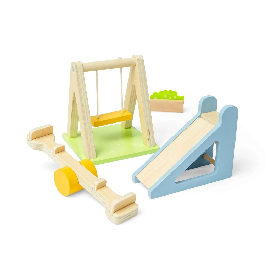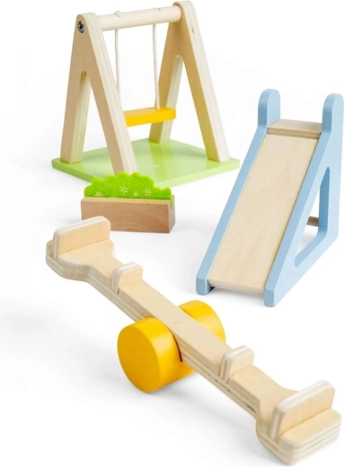 Verander de tuin van je poppenhuis in een plek vol beweging en fantasie. De set bevat de populairste elementen van een speelplein – een schommel, glijbaan, wip en een decoratief bloemenperk. Dankzij de gladde houten onderdelen in zachte pasteltinten is de hantering prettig en veilig.