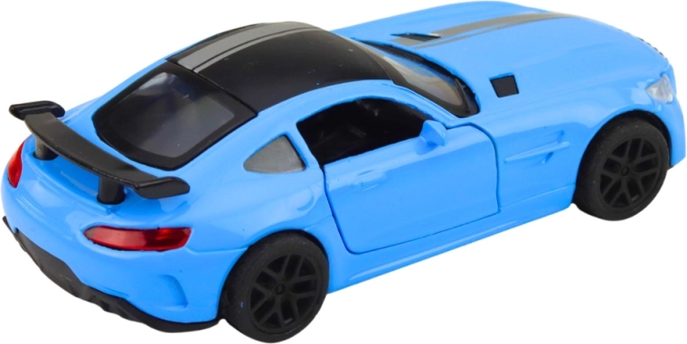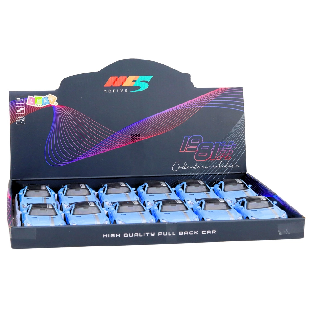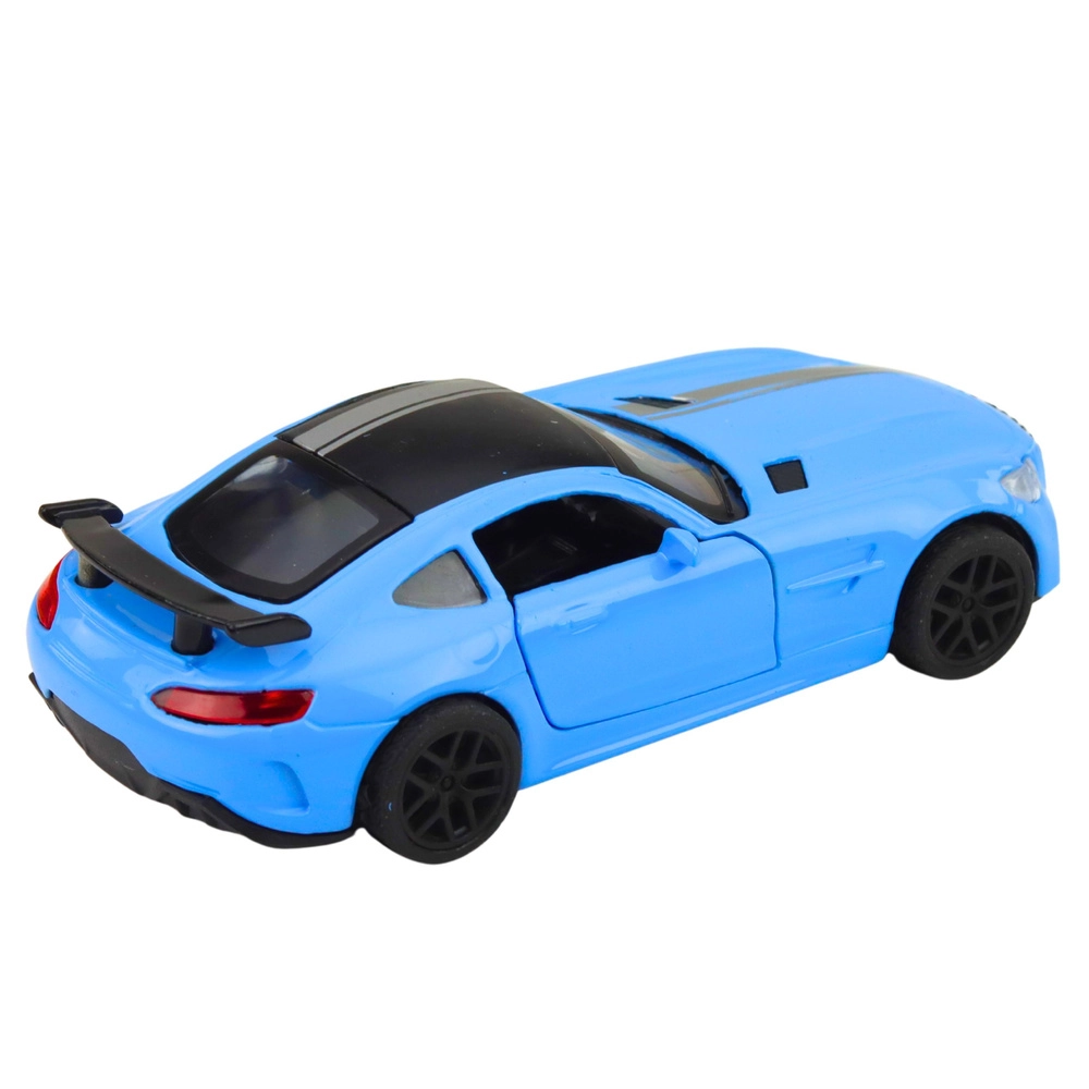 Een stijlvolle metalen model-sportwagen op schaal 1:32 met realistische afwerking en dynamische lijnen. De blauwe carrosserie met zwarte details en spoiler geeft het model een agressieve uitstraling. Dankzij de openslaande deuren, lichteffecten en motorgeluiden biedt hij extra speelplezier en een aantrekkelijke presentatie in de collectie.