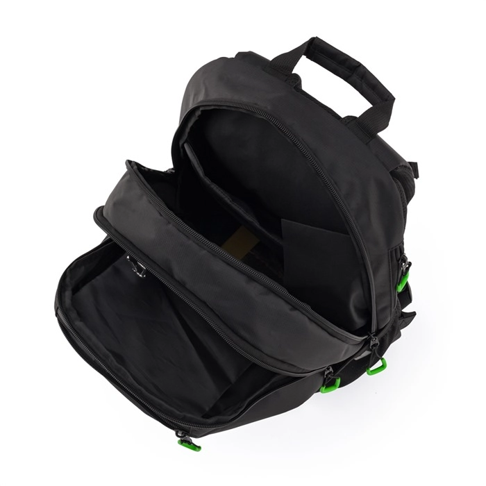 Twee hoofdvakken, een voorvak, een interne organizer en een verstevigd laptopvak houden alles overzichtelijk en veilig.